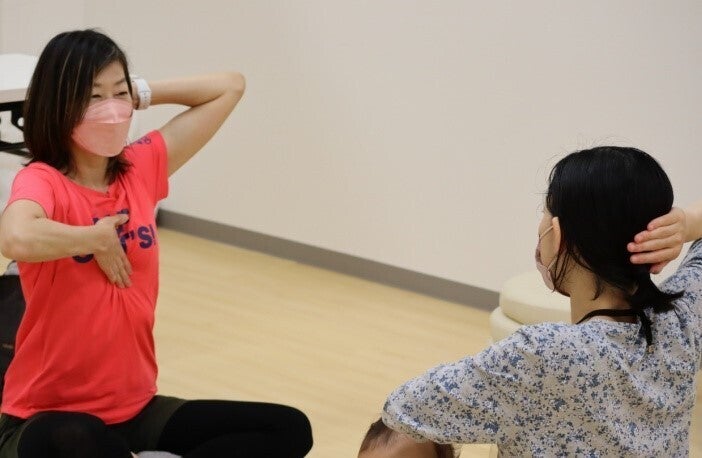 乳がん啓発運動指導士の皆様イベントの中で、日常生活の乳がんセルフチェックに取り入れられるストレッチをレクチャーしています。忙しい毎日で自分の身体のことがおろそかになりがちな子育てママ。子供と一緒に参加できるこのイベントは乳がんの啓発、またママが自身の健康を気に掛けるきっかけになると強く思います。心より応援しております。