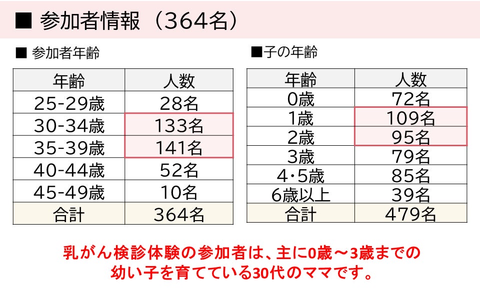 幼児を育てている多くのママは、子育てに手いっぱいで自分のことを後回しにしてしまう傾向が高く、乳がん検診体験会参加者に実施したアンケートでも約8割のママが「乳がん検診を受けたことがない」「出産後3年以上乳がん検診を受けられていない」と回答しています。