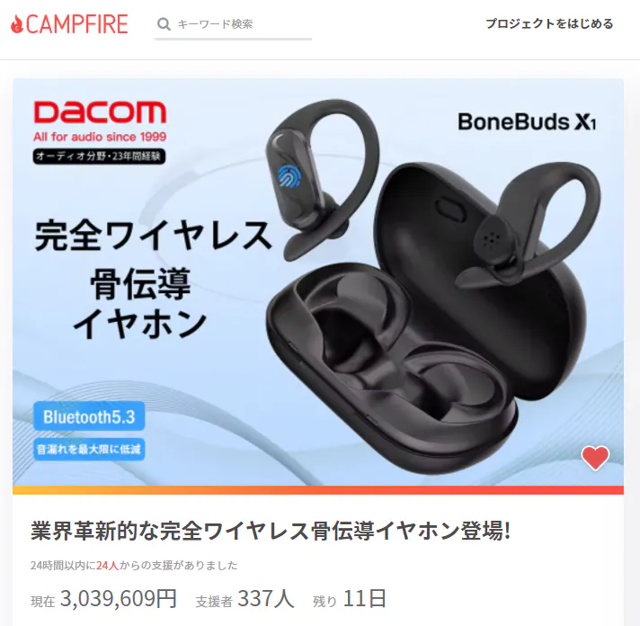本日、おかげさまで新品「BoneBuds X1」は達成率1500%、支援総額300万円を突破しました!!「BoneBuds X1」が皆様に気に入っていただき、大変感動しております。