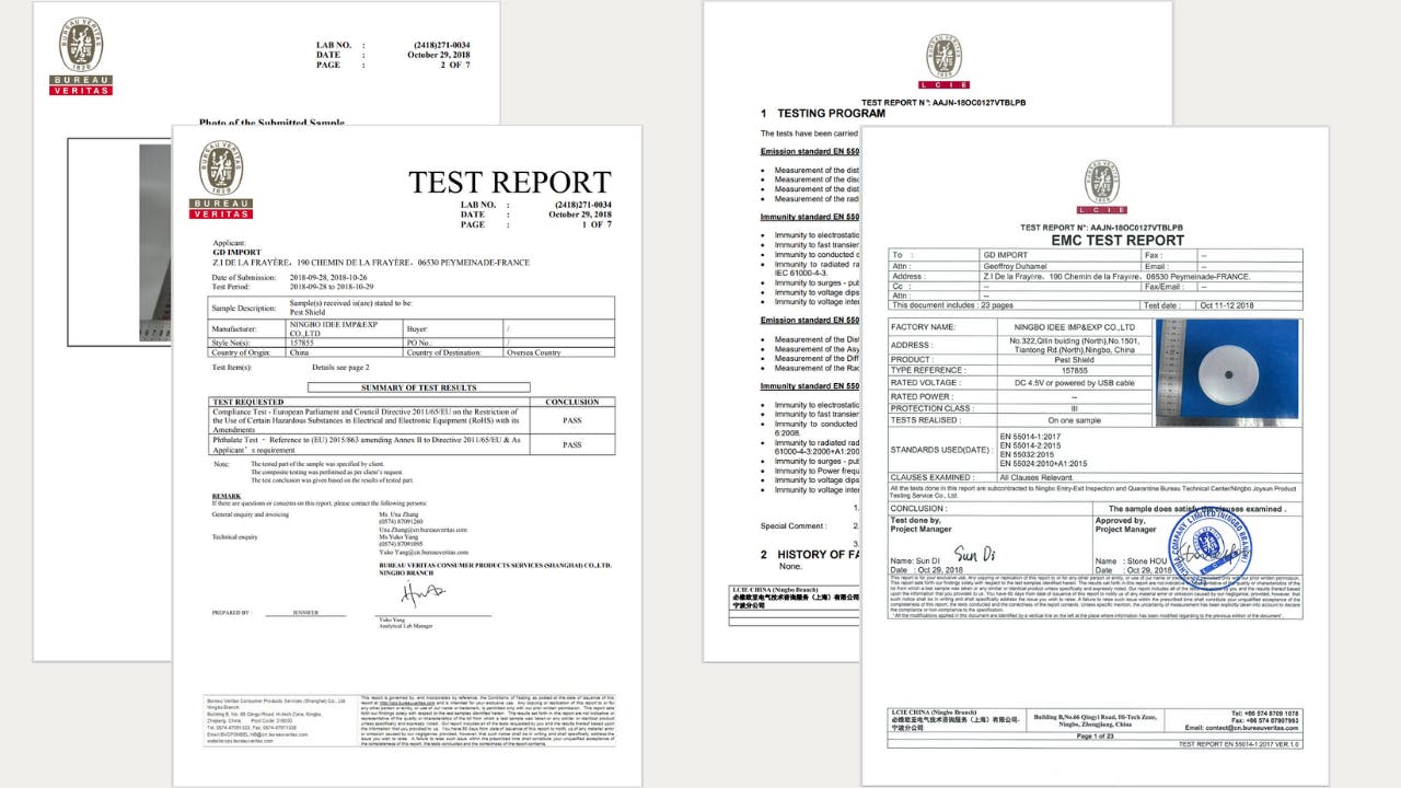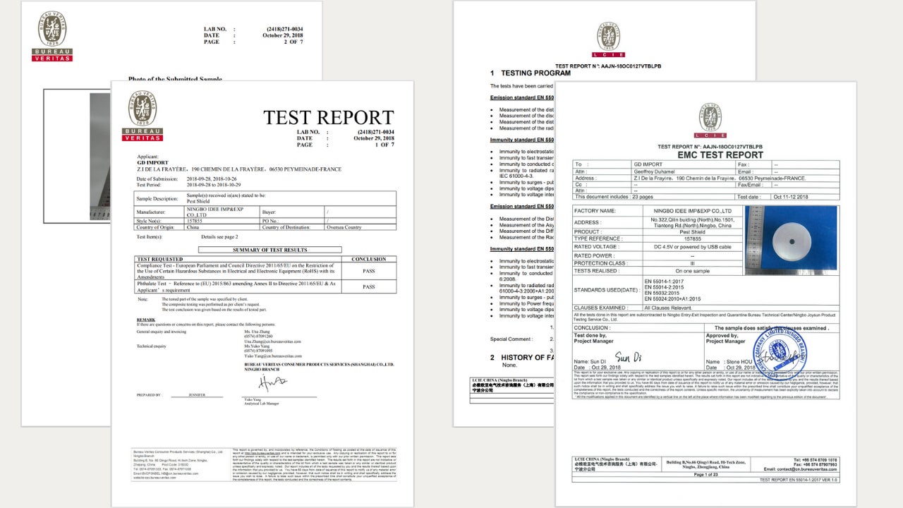 >【Pest Shield 】はEU諸国で販売する際に人体に危険が及ばないことを証明するCEマークを取得し、有害物質を使用していないことを証明するRoHS(危険物質に関する制限令)も実施済みです。