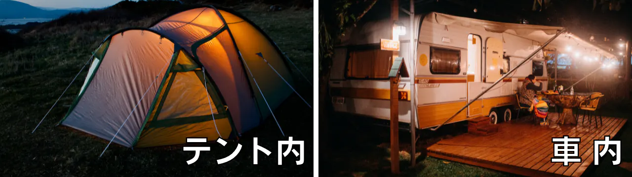 →テント内や車内でも使用可能。電池での使用は1か月程度もつので数日の連泊でも充電切れや追加充電の心配はありません!危なくないので寝ている間も使用できます。