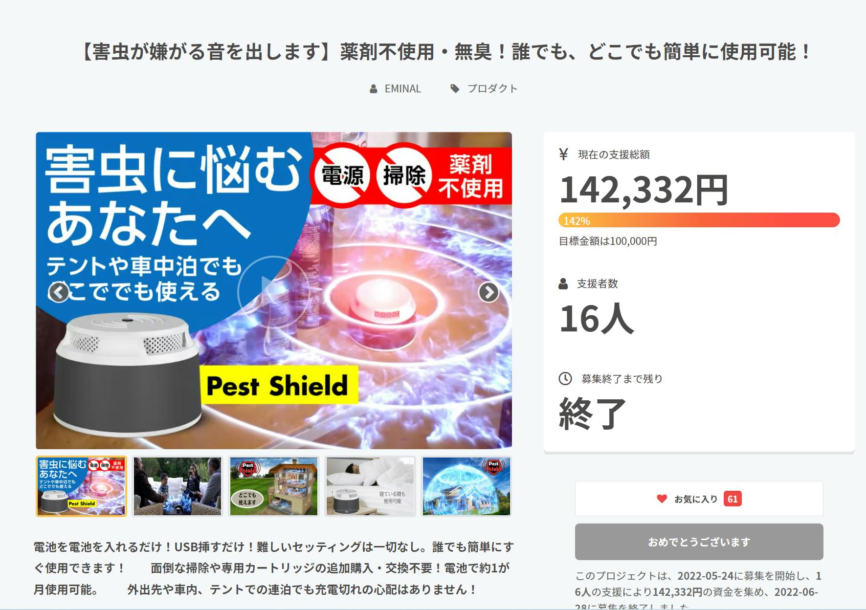 このプロジェクトは、2022/05/24に募集を開始し、 16人の支援により 142,332円の資金を集め、 2022/06/28に募集を終了しました