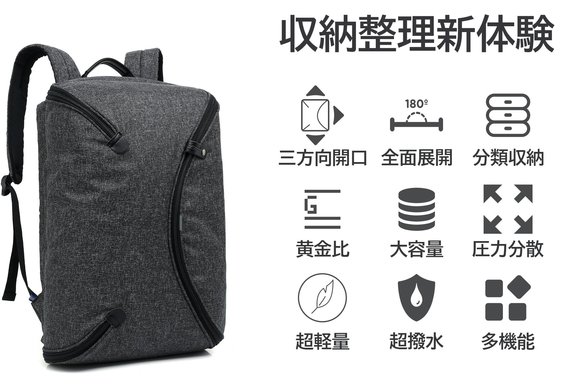 「Ados」はファスナーの開き角度を調整し、異なる位置により、上部、サイドと底部の三つの角度から別々に開くことができ、使い勝手が大幅に向上させるリュックです。