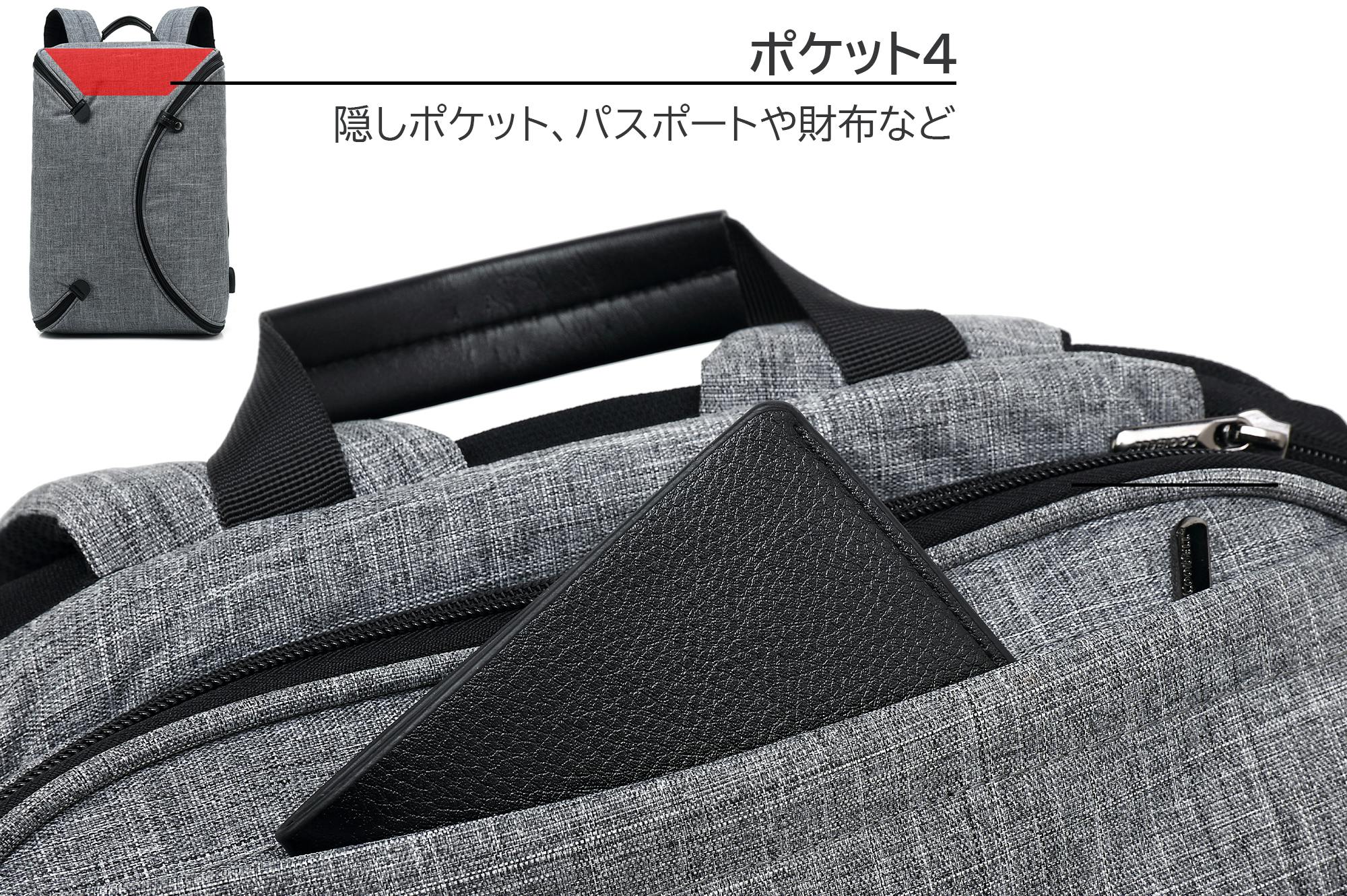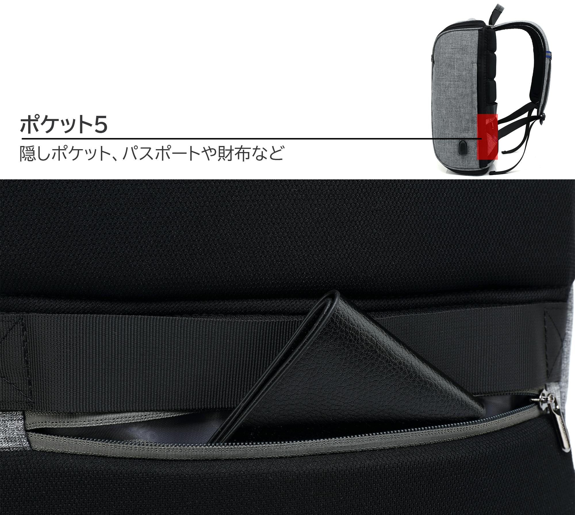 また、盗難防止のため、隠しポケットが2つ設置されています。パスポートや財布など使用頻度の高いアイテムを手軽に出し入れができます。