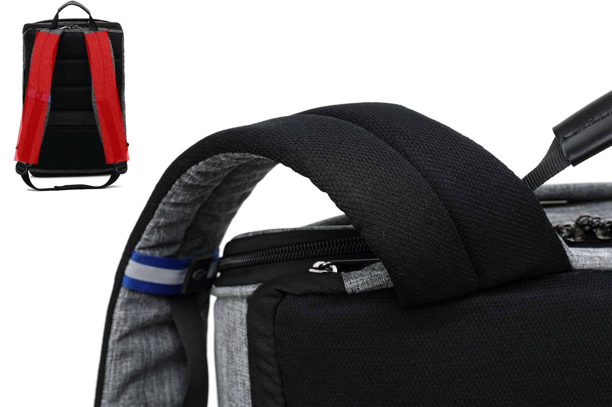 普通のショルダーストラップより厚く広い多層ハニカムメッシュ素材から構成され、接触面積を増やし、肩に加わる圧力を均一に分散させる効果を持ちます。