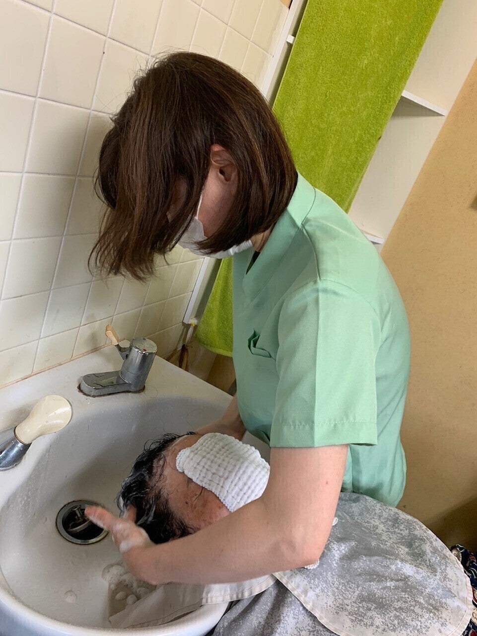 訪問美容師さんの中には器用な方は自作でシャンプー台を作って使用したり、訪問美容用の専門的な道具を購入して使用する美容師さん、あるいはお客様のご自宅のお風呂場や洗面所などをお借りしてシャンプーしたりする方もいらっしゃるのですが、やはり体がご不自由な方ですと無理な体勢になります。