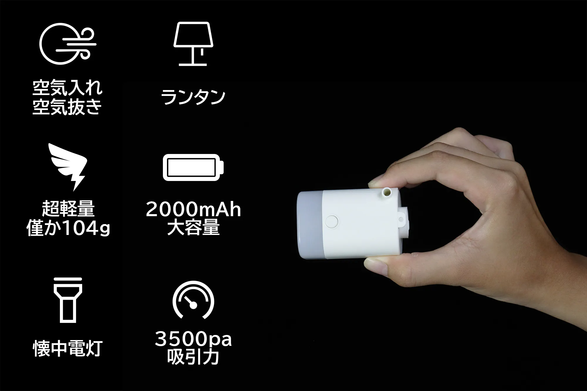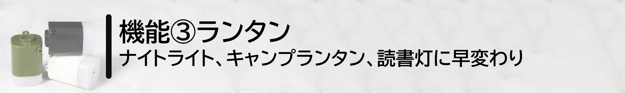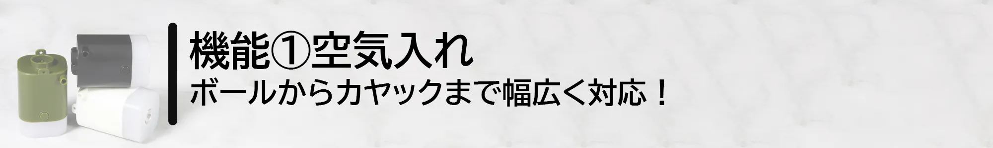この度は小型アイテムへの空気入れ・空気抜き機能、家でもアウトドアでも大活躍なランタン機能と懐中電灯機能、初心者も簡単に扱える多機能ミニエアーポンが登場。