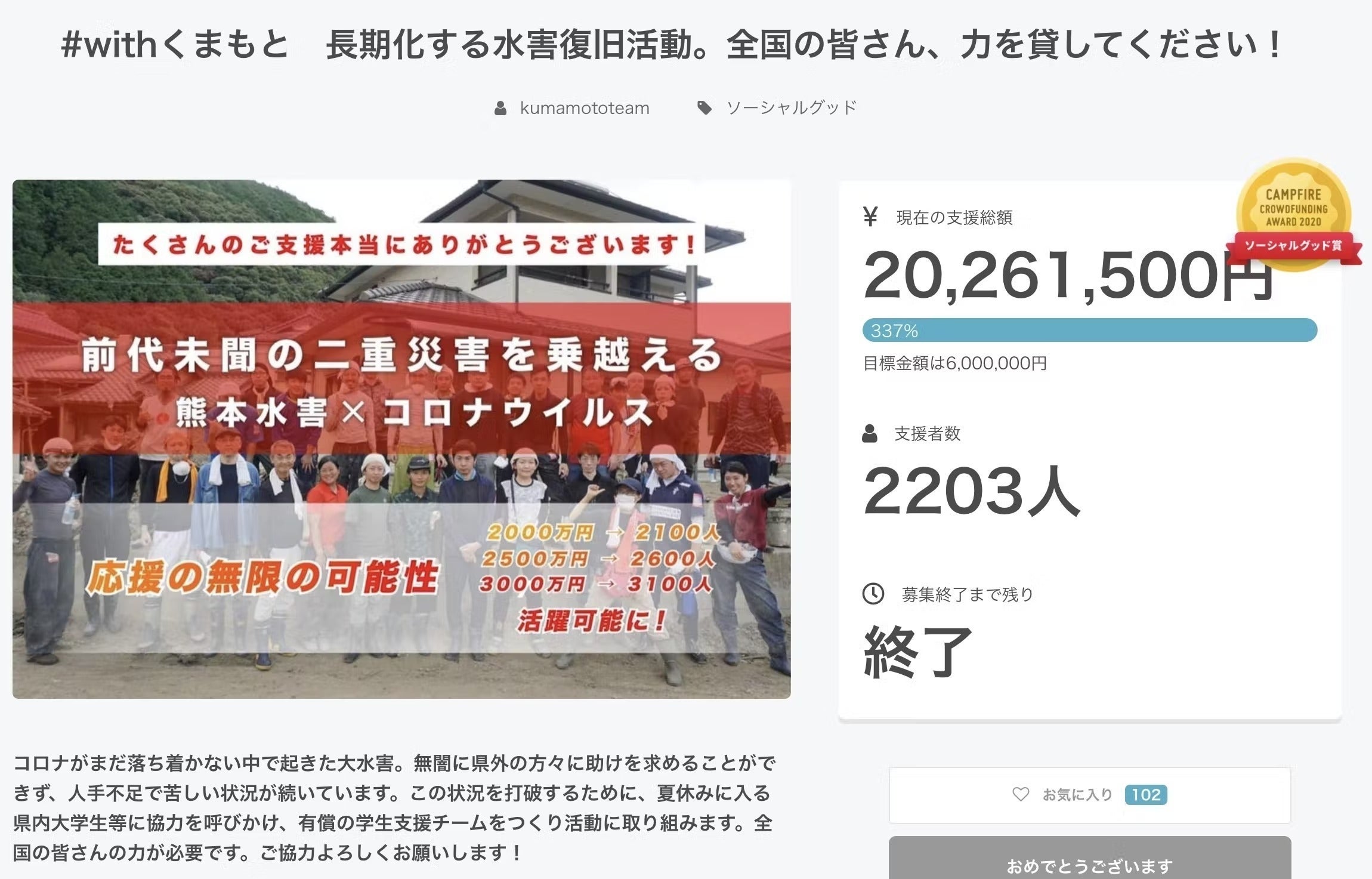 沢山の方に支えていただいた熊本水害支援の活動はジャパンレジリエンスアワードも受賞しました