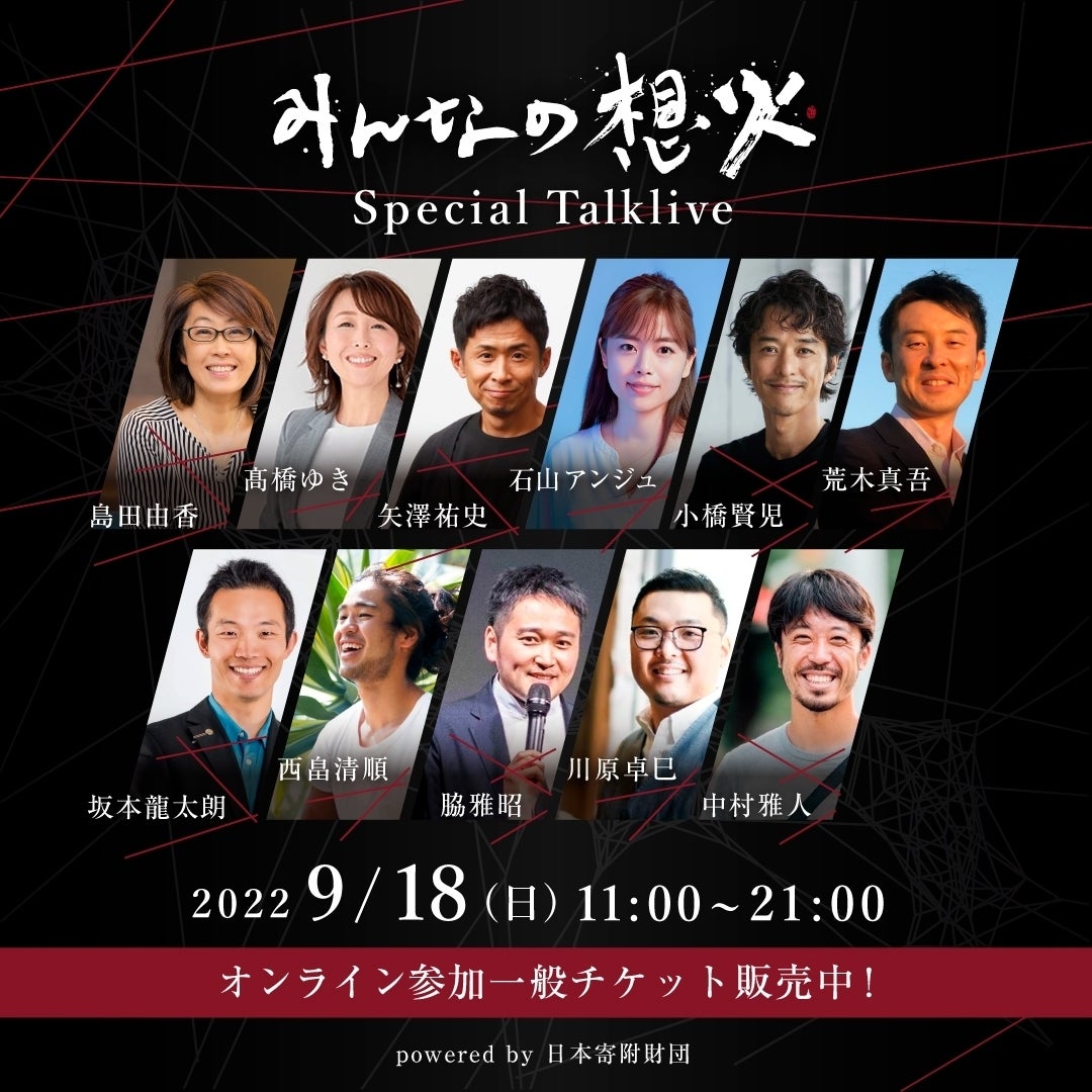 2022/07/25 14:24みんなの想火2022 クラウドファンディングいよいよラストスパートとなりました。現在、目標金額800万円に対して6,385,000円252人の方にご支援いただきました。残り161万円。多くの方にご支援いただき、本当にありがとうございます。あと、もうひと押し、どうかみなさんのお力を貸してください。ラスト2時間半となる明日7/26 21:30〜最後に、心強いゲストの皆様に応援いただけるとことになりました!YeeY Inc. のY・Y・Yこと島田 由香 さん(元ユニリーバ・ジャパン・ホールディングス合同会社 人事総務本部長)髙橋ゆき さん(株式会社ベアーズ 副社長)矢澤 祐史 さん(Giveness International 代表)それぞれの領域で社会のウェルビーイングをデザインするこの3名と、みんなの想火代表池田親生とで、トークライブの配信を行います!このプロジェクトのやる意味・意義を再確認しながら、クラウドファンディングのラストスパートをもうひと押ししていただきたいと思います。必ず奇跡は起こると信じています。奇跡のゴールを、ぜひみなさん見守っていただけたら嬉しいです!参加方法はFacebookのイベントページでお知らせしますので、覗いていただける方はイベントページへのご参加お願いいたします!https://fb.me/e/1zQM0KFAs*LIVE配信方式で行います*配信方法はイベントページでお知らせします*入退室は自由なので、ぜひ5分でも10分でも覗きにきてください! もっと見る