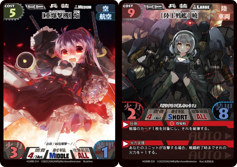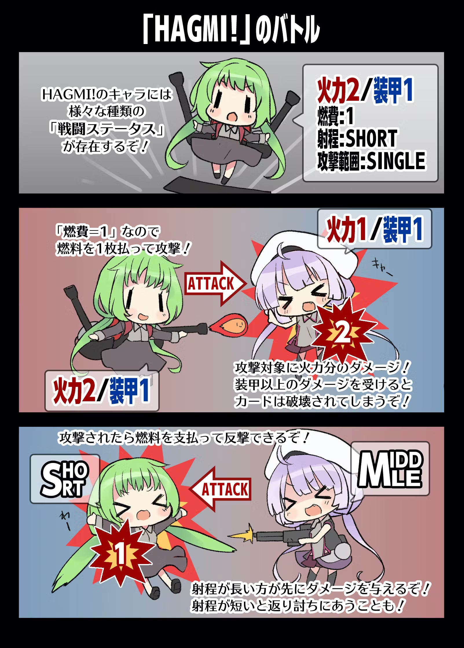 HAGMI!では「耐久値以上のダメージを受けたら破壊される」というカードゲームのお約束に則った上で、「攻撃や反撃にはコスト(燃料)が必要」「射程が長いものから先にダメージを与える」等、兵器的な要素を取り入れています。