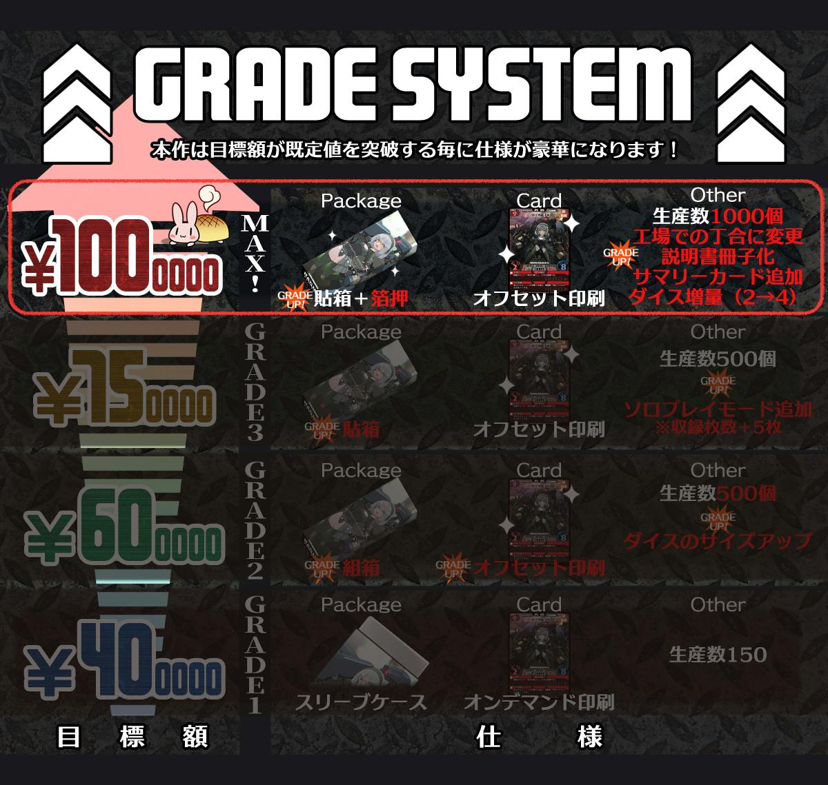 グレード3までは「必要の半分の種類のカードを倍の数刷り、手作業で丁合を行う」という小細工でコストを抑えておりますが、その必要がなくなるため、組み立てに必要な時間がほとんど軽減されます。