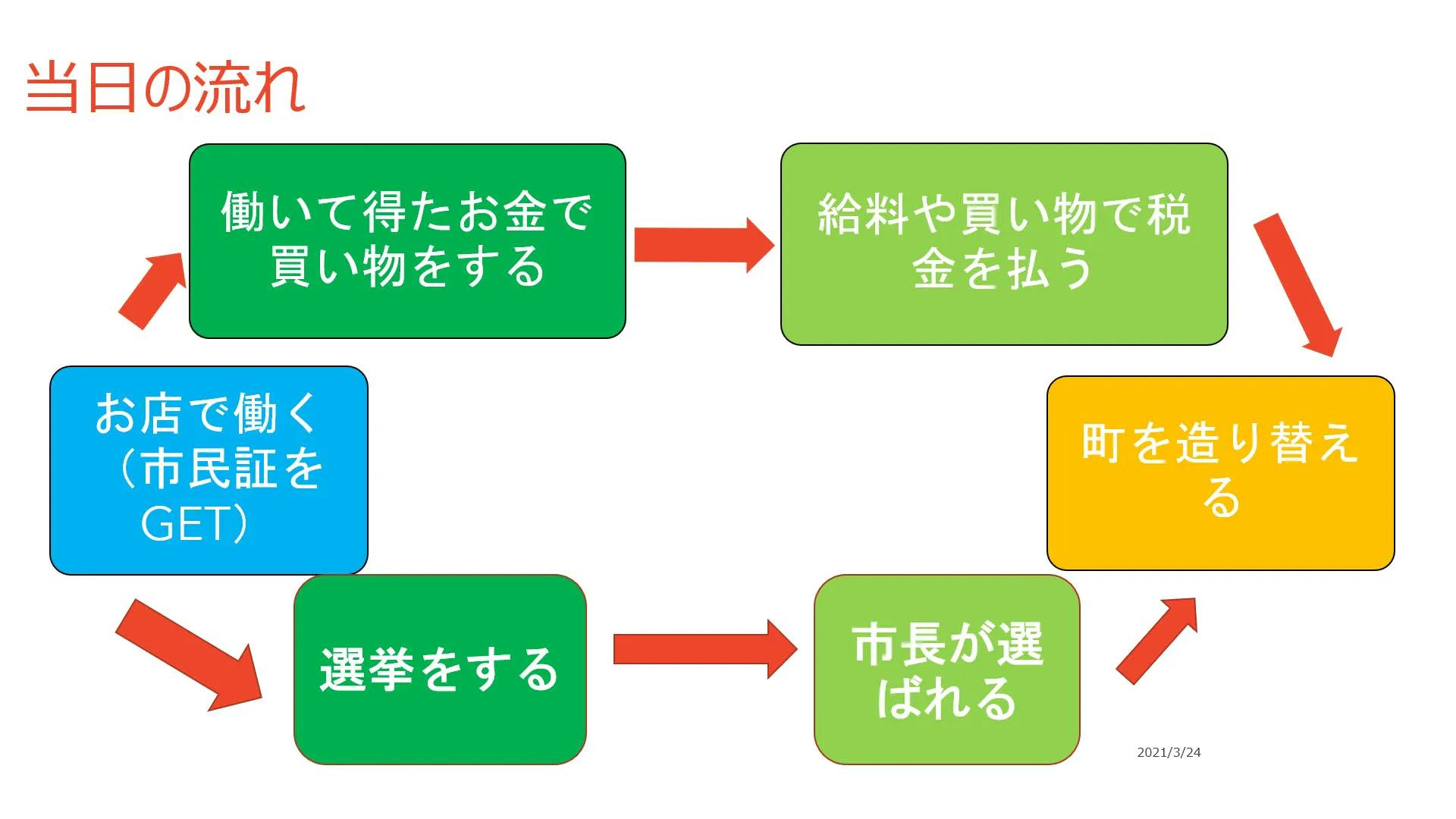 このような目標をたて、実際にこどもたち自身が考えたお店を出し、売り上げたお金でものを買い、税金の流れを目で感じながら経済の動きを見ていきます。また、事前学習のメンバーの中から、あらかじめ町長選挙の結果をもとに町長を決め、イベント中にもう一度町長選挙を行い、政治参加を実際に行ってもらう予定です。