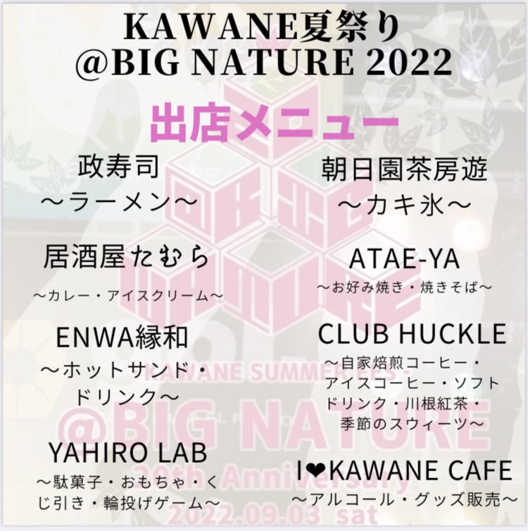 2022/08/29 20:00いよいよ今週開催される『KAWANE 夏祭り@BIG NATURE 2022』当日の会場を盛り上げてくれる出店店舗さんの紹介です!!ラーメンからカレー、ホットサンドにスウィーツにかき氷から、お子様には駄菓子、もちろんアルコールに映えドリンクまで!!抜かりなく取り揃えております!!地元飲食店さんの自信作の飲食ブースが出店されます!!もうこの際、全店制覇しちゃいましょう!! もっと見る