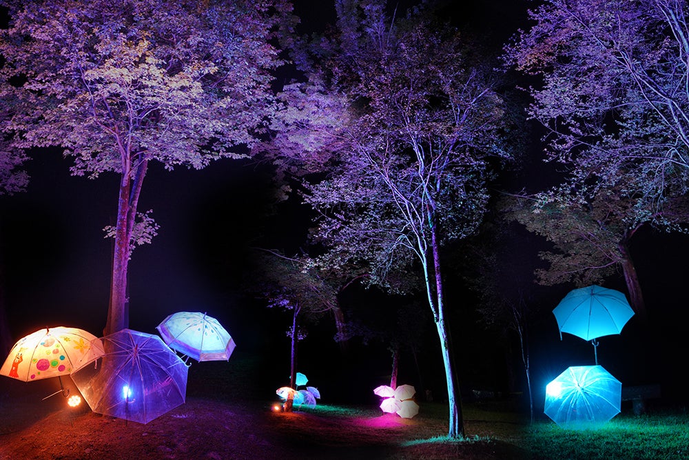 昼間には傘に絵を描くワークショップを開催し、夜にきのこのようにライトアップ。