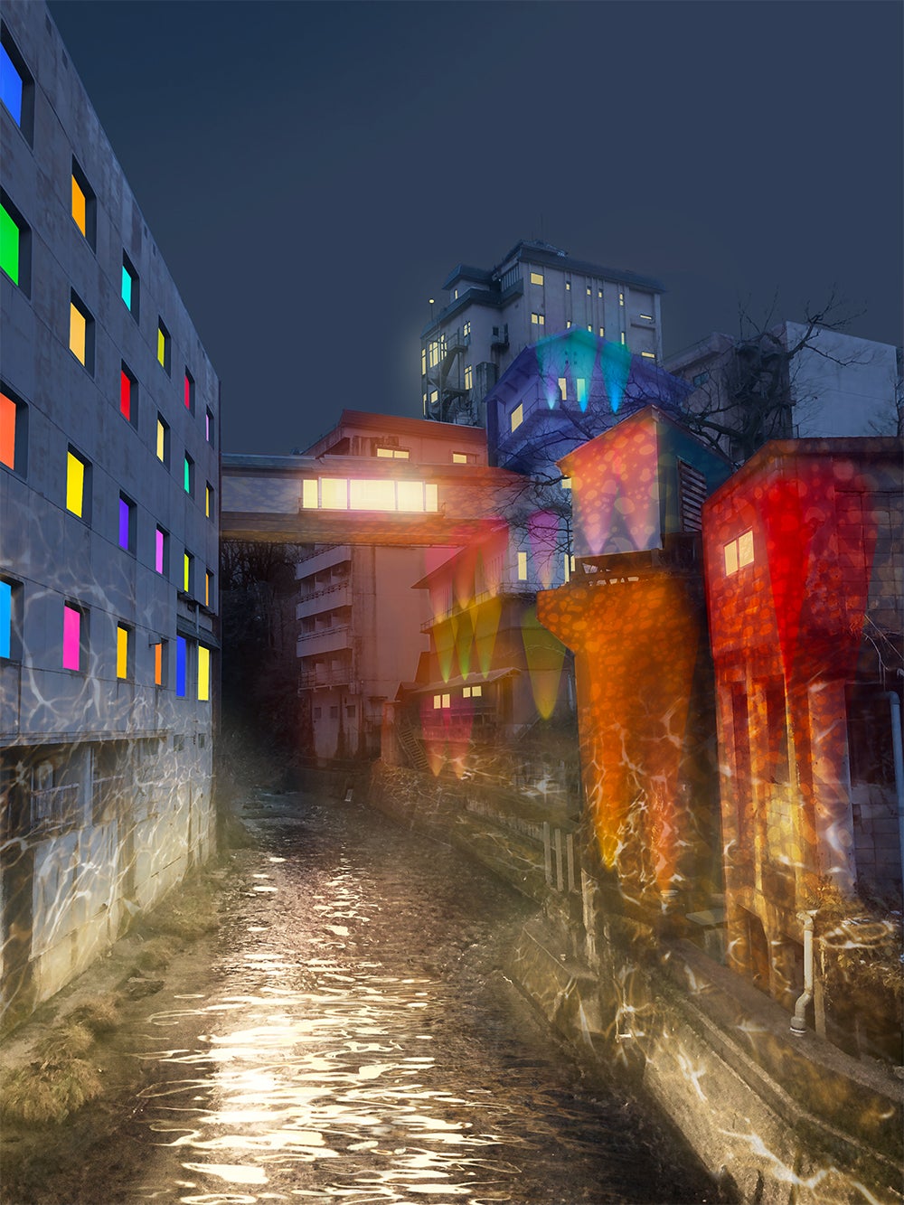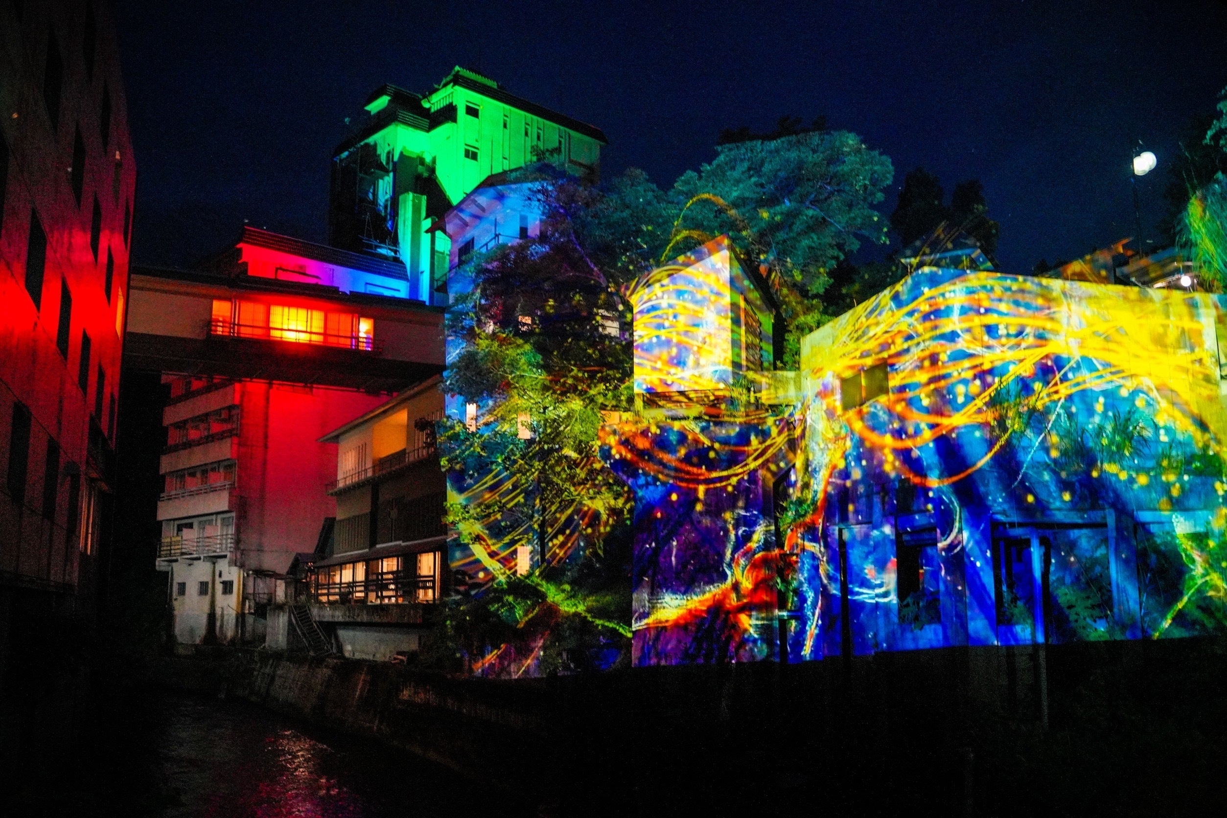川沿いのライティングや、旅館の壁に映し出すプロジェクションマッピング。
