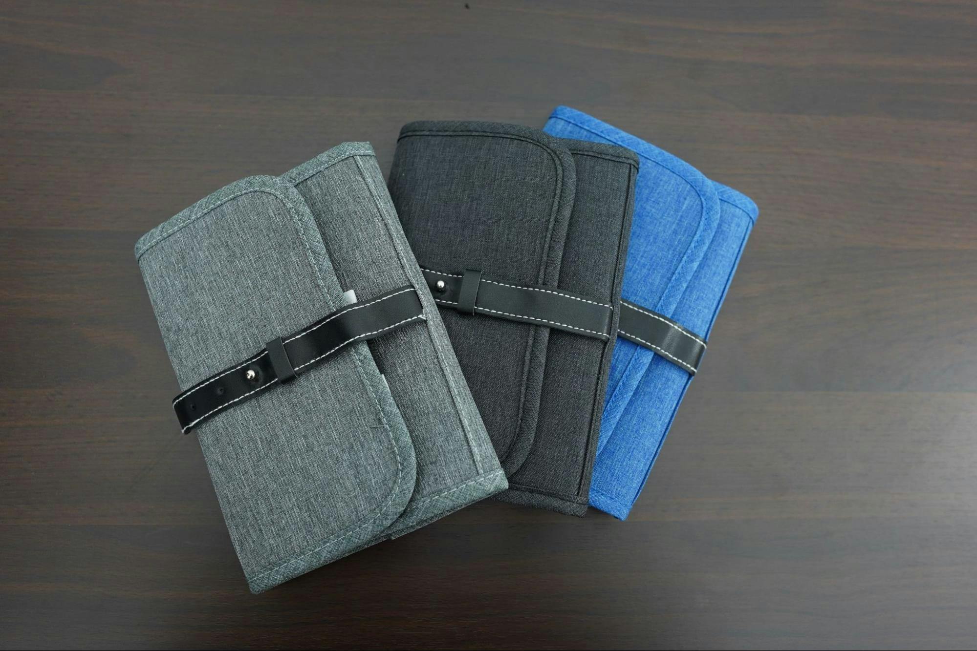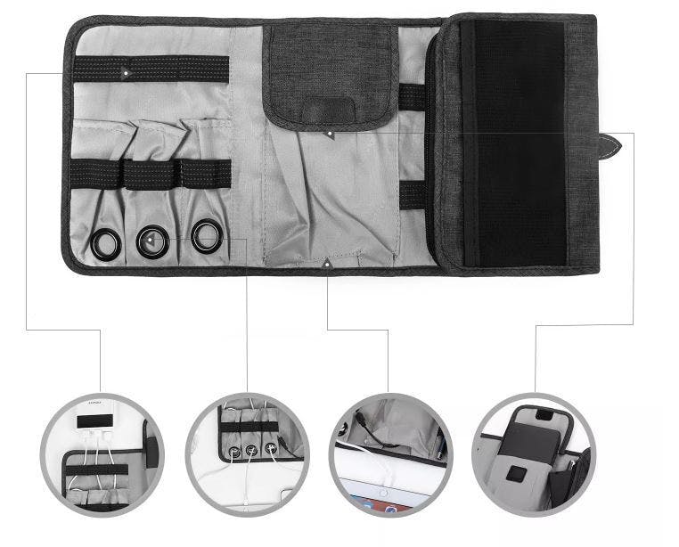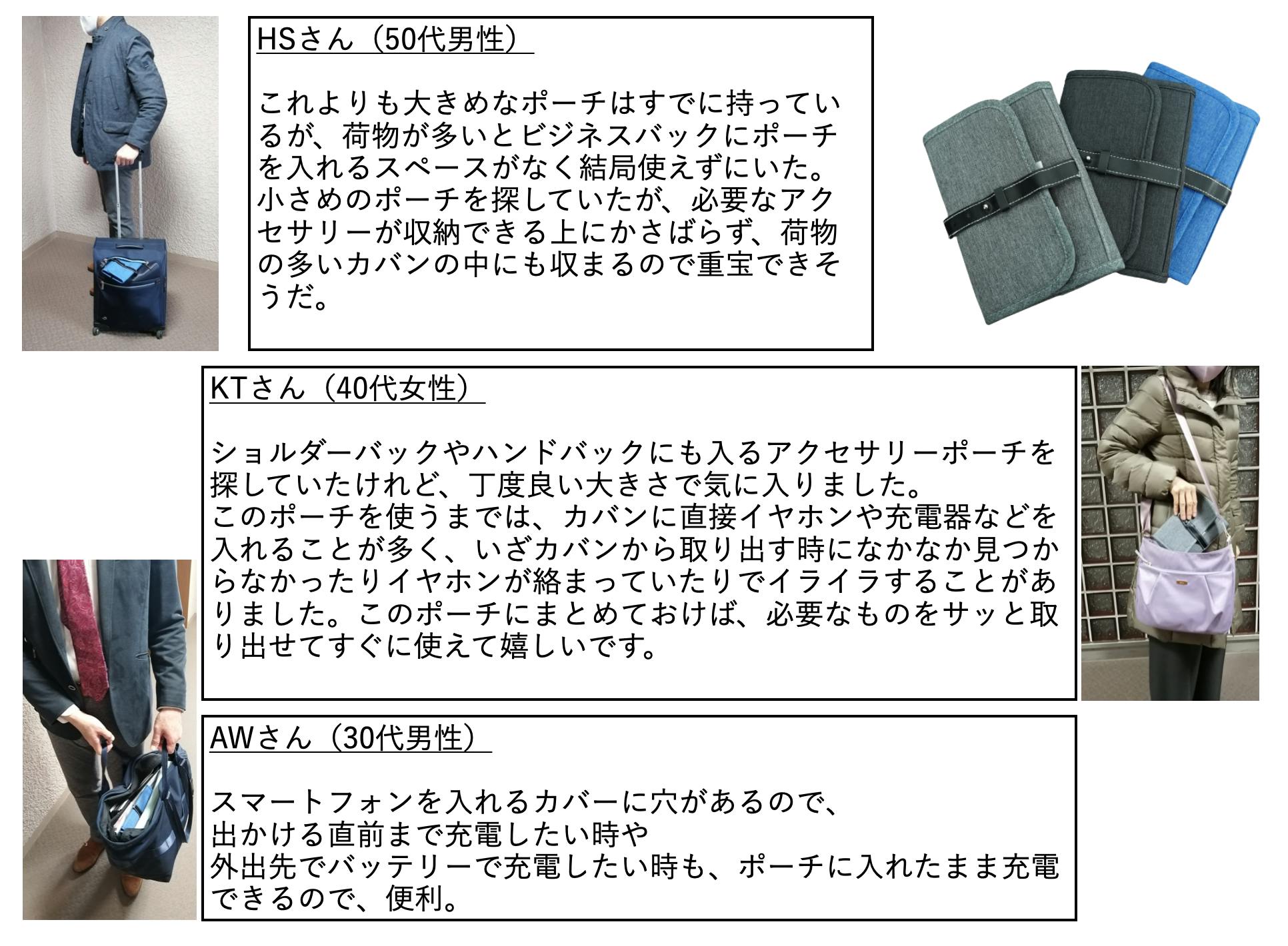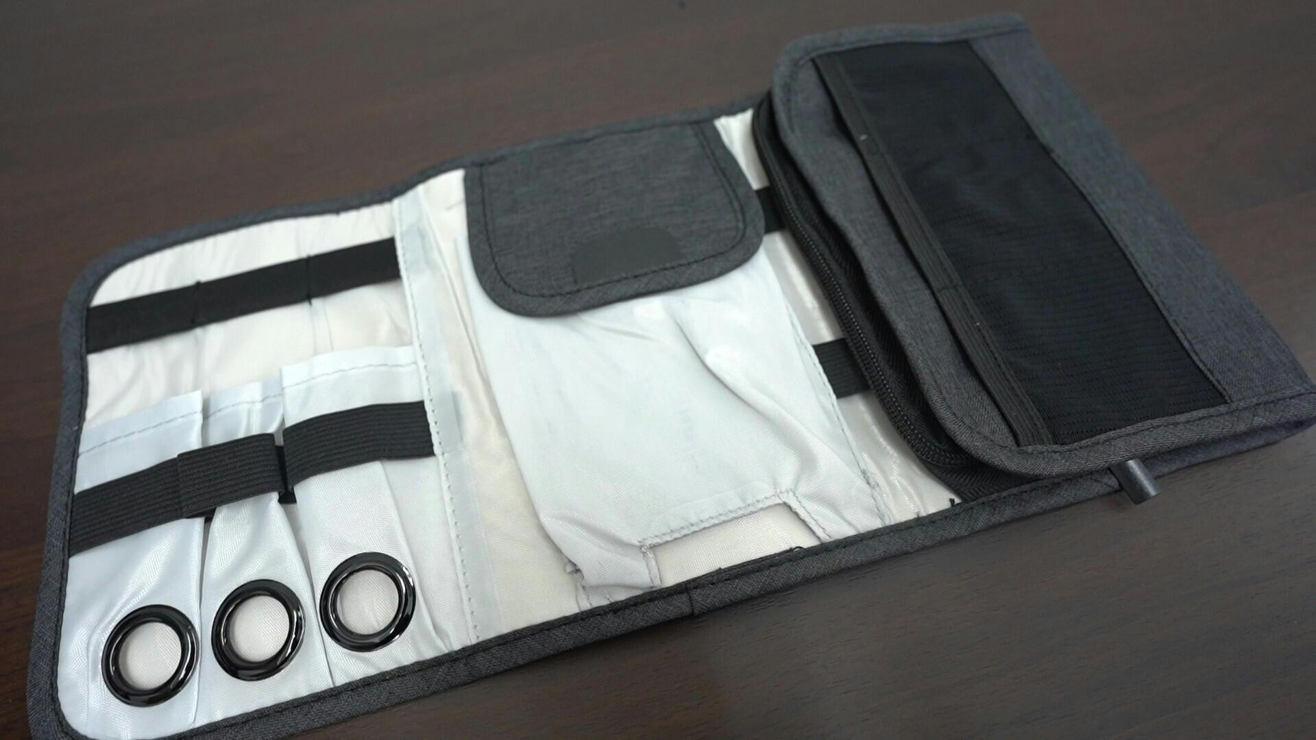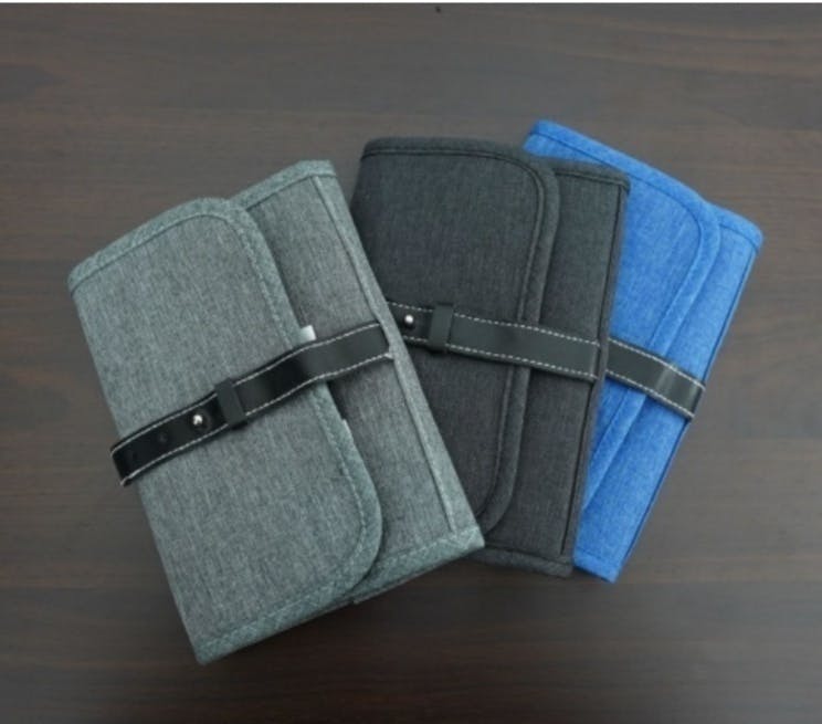 そこで必要最低限のエレクトロニクスアクセサリーをまとめることができ、家でも外出する時も入れ替えが不要、かつ、ポーチに入れたままバッテリーにつないで充電もできる収納ポーチをリリースしました。