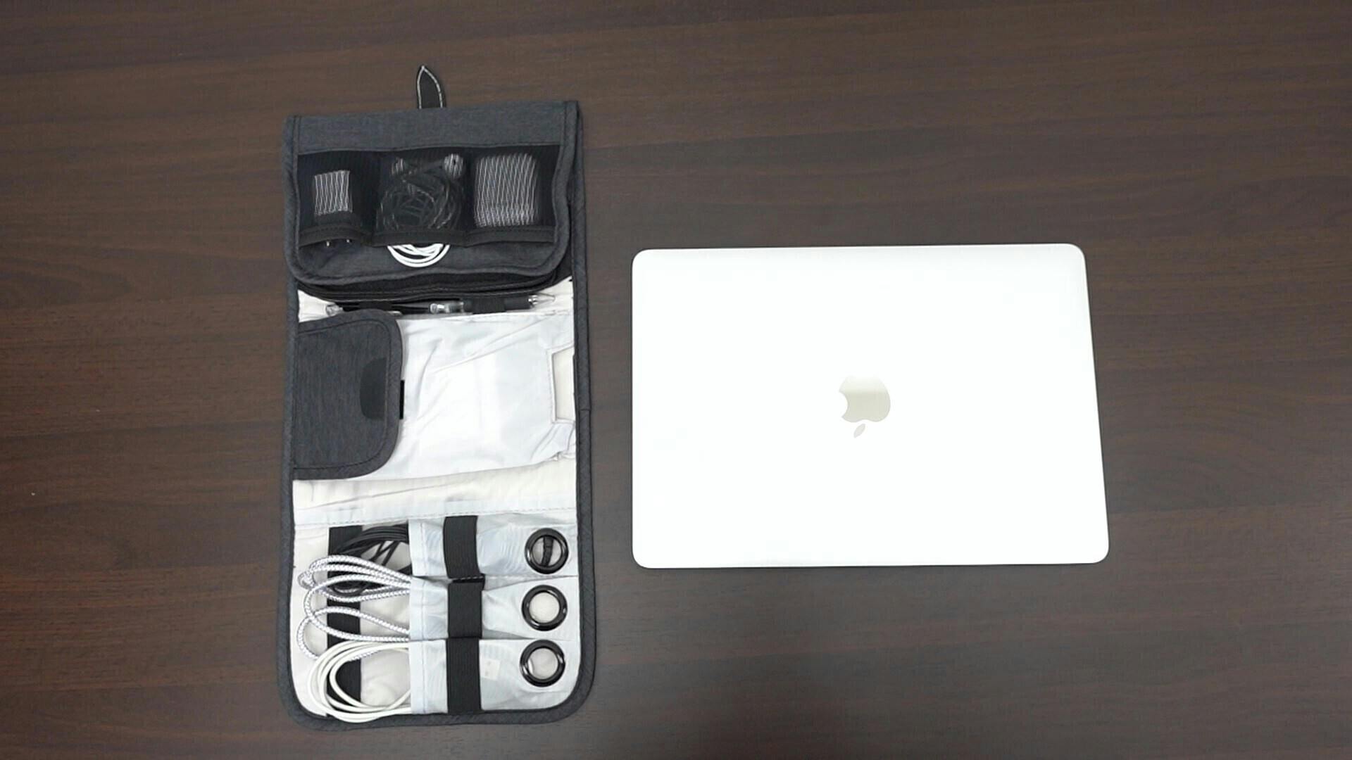 ポーチを開くとPC周りの小物やケーブルをすぐに取り出せるような設計になっています。