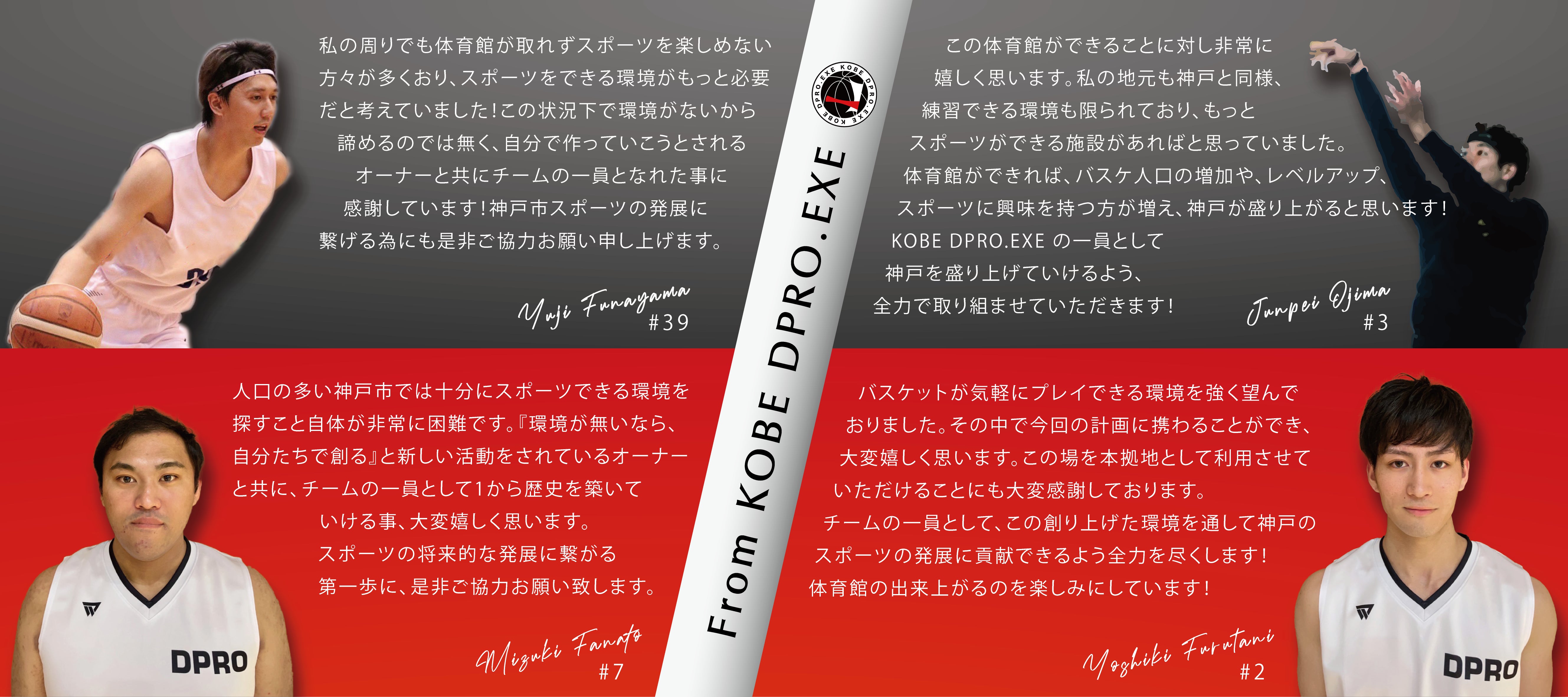 また、本プロジェクト始動にあたり、体育館を本拠地として活動予定のKOBE DPRO.EXE(3X3プロバスケットボールチーム)の一部メンバーからメッセージをいただきましたのでご紹介いたします。