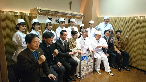 1月18日、築地玉寿司晴海通り店にて記者発表会が行われました。 10社以上のご参加を頂き、当日、翌日と大変たくさんのニュースに取り上げて頂きました。渡辺裕之さん、山本圭壱さん、長江健次さんなどに加え、元ドロンズの大島直也さん、前作も出演した若井おさむさんなど、続々と出演者発表もされています。