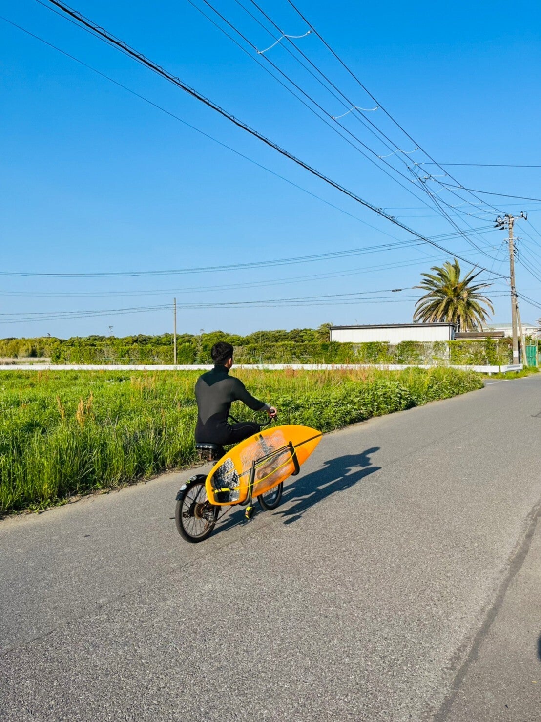 ウエットスーツのままサーフボードを持って道を歩いていたり、ボードキャリアのついた自転車やバイクに乗って走っています。