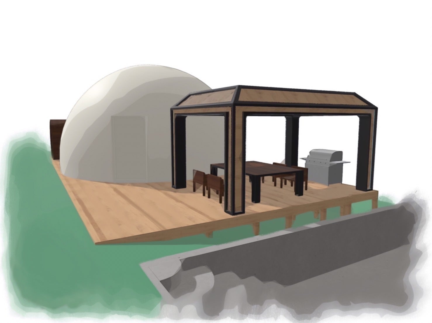 夏や冬でも快適に過ごして頂けるドームテントに、ウッドデッキにはダイニングスペースを設計。