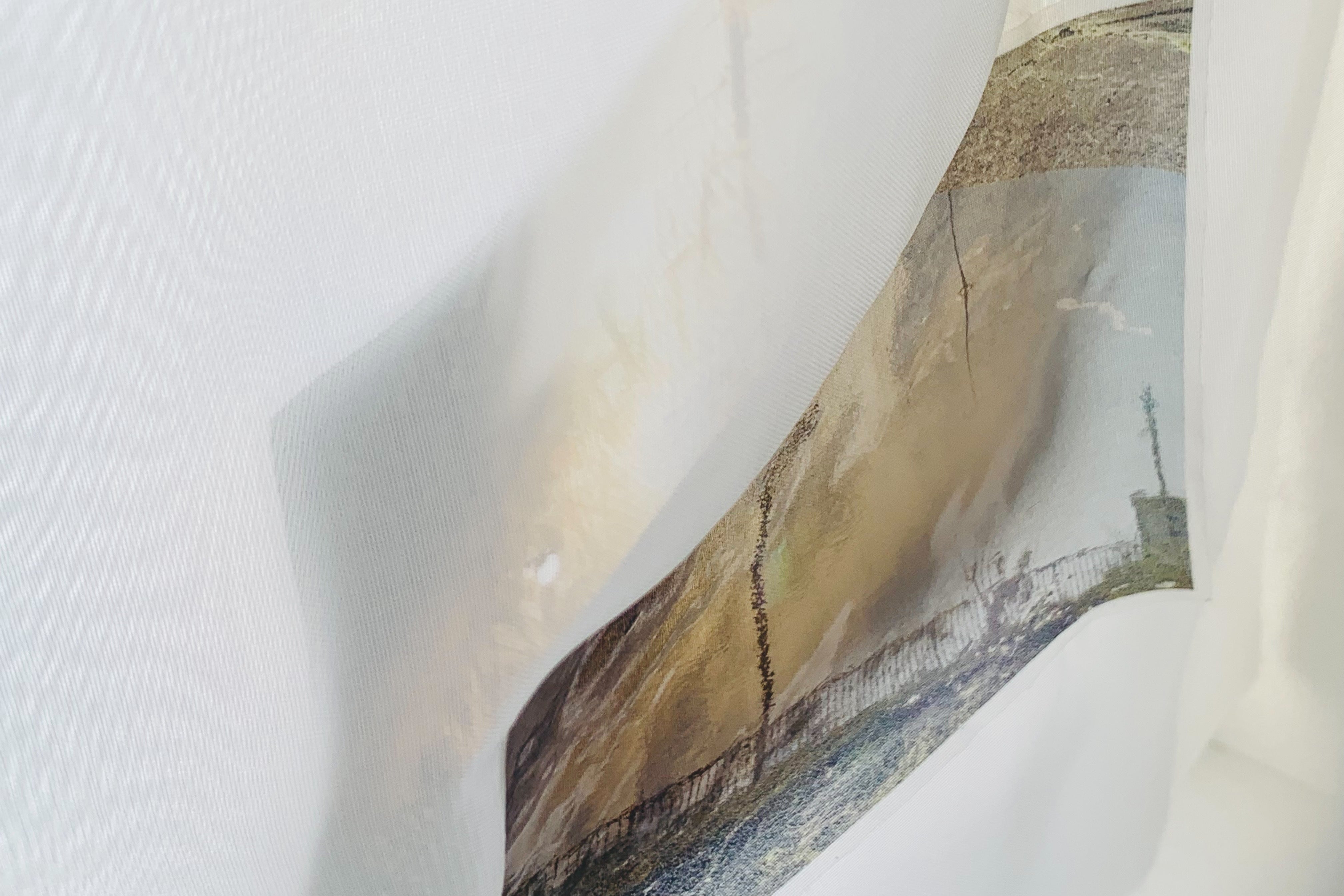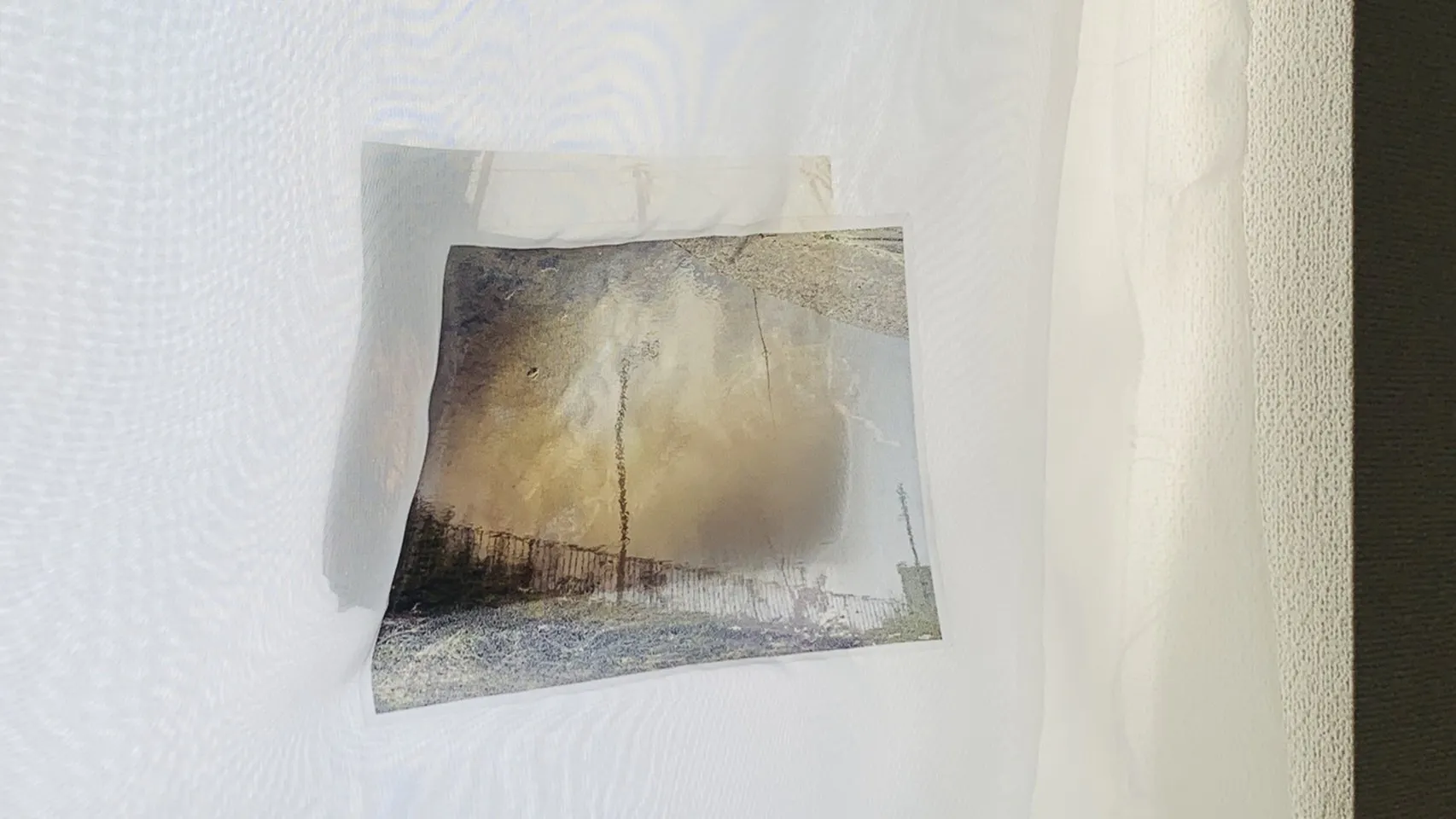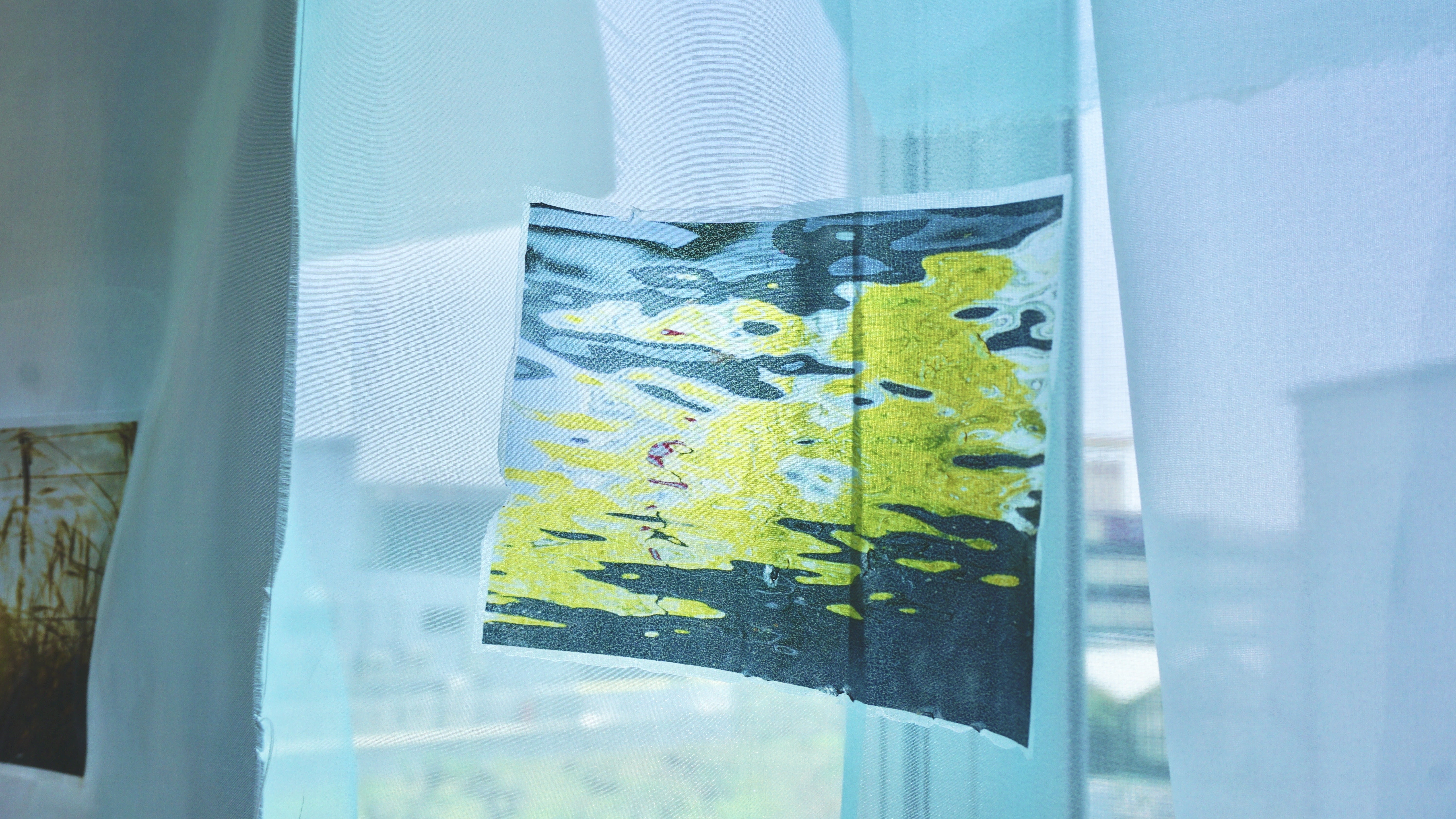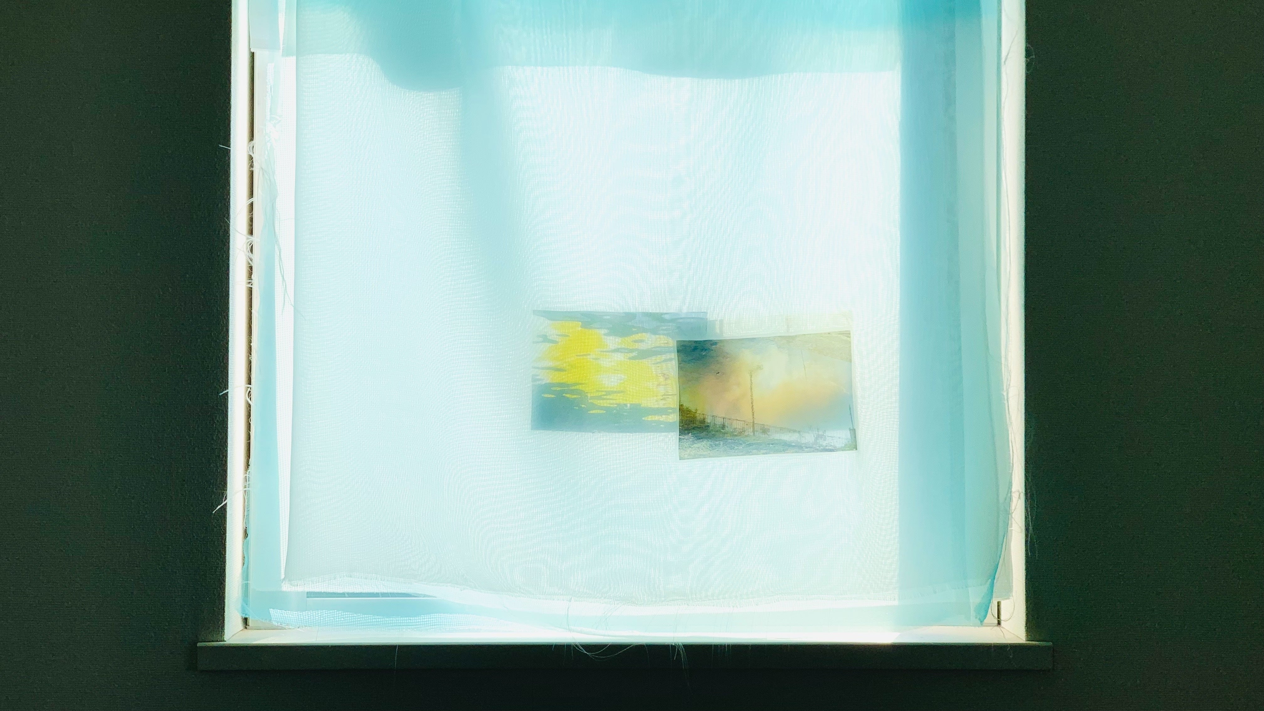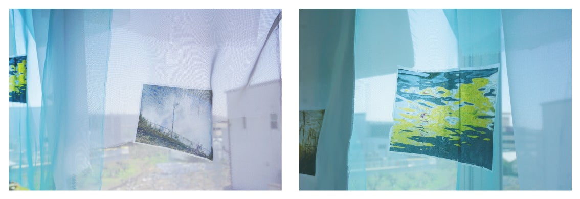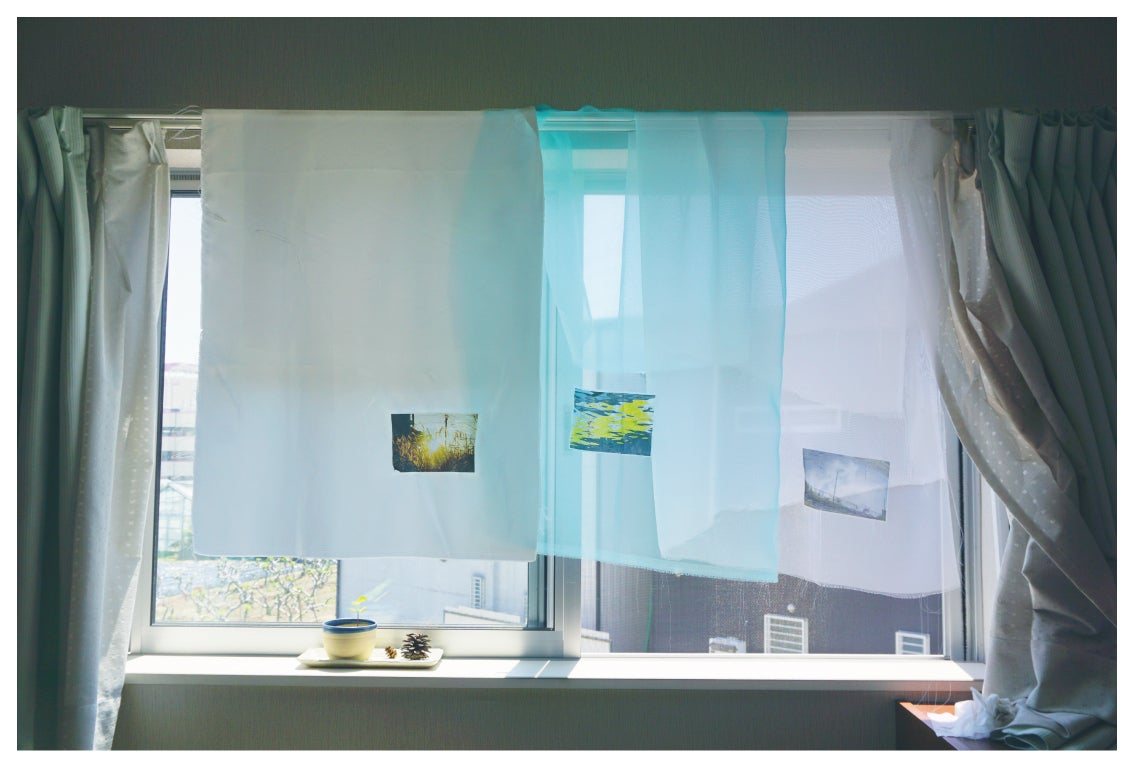 自宅で空間演出の実験をした時の様子。布に写真を転写することで、布が額装代わりとなり、写真自体も揺れる上に、写真がうっすらと透けて、実風景の中に溶け込みます。儚い瞬間を捕らえる写真というメディアを布に転写すると、再び儚さを取り戻し、鑑賞者によりその写真の空気感や魅力が伝わるのではないかと考えました。