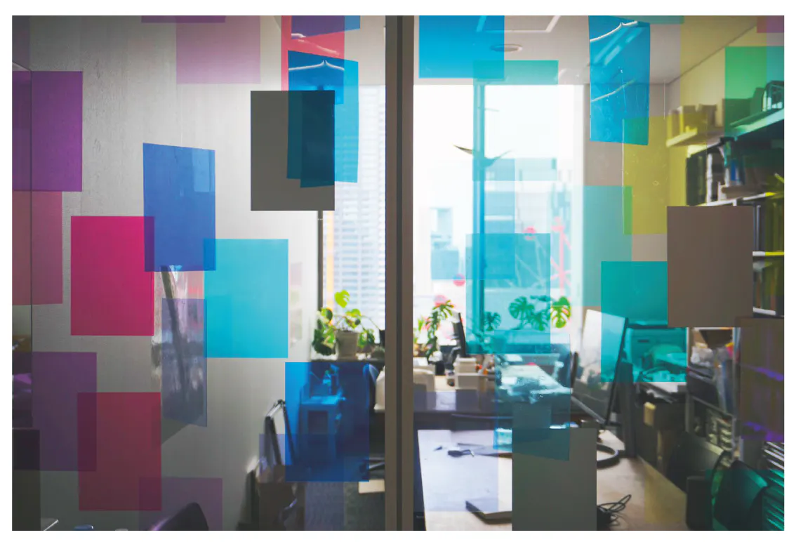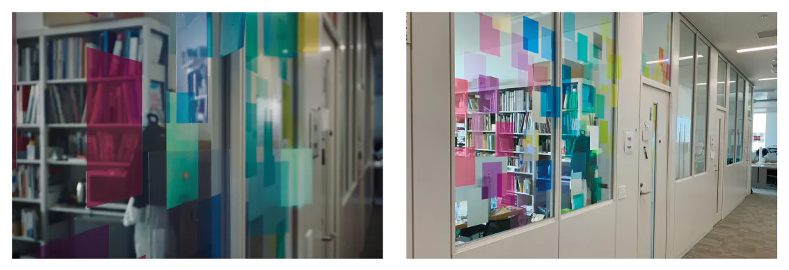 窓が開けられないガラス窓に対して、ガラス面の両面に色のついた半透明のカッティングシートを貼り、さらに室内側と廊下側のピクチャーレールからカッティングシートを吊るしました。このことでガラス面を中心に4つの色の層をつくり出しました。室内の空調機の微風と、廊下を通る人の動きによって吊るしたカッティングシートが揺れ、まるで風が吹き抜けたような爽快感のある風景となりました。