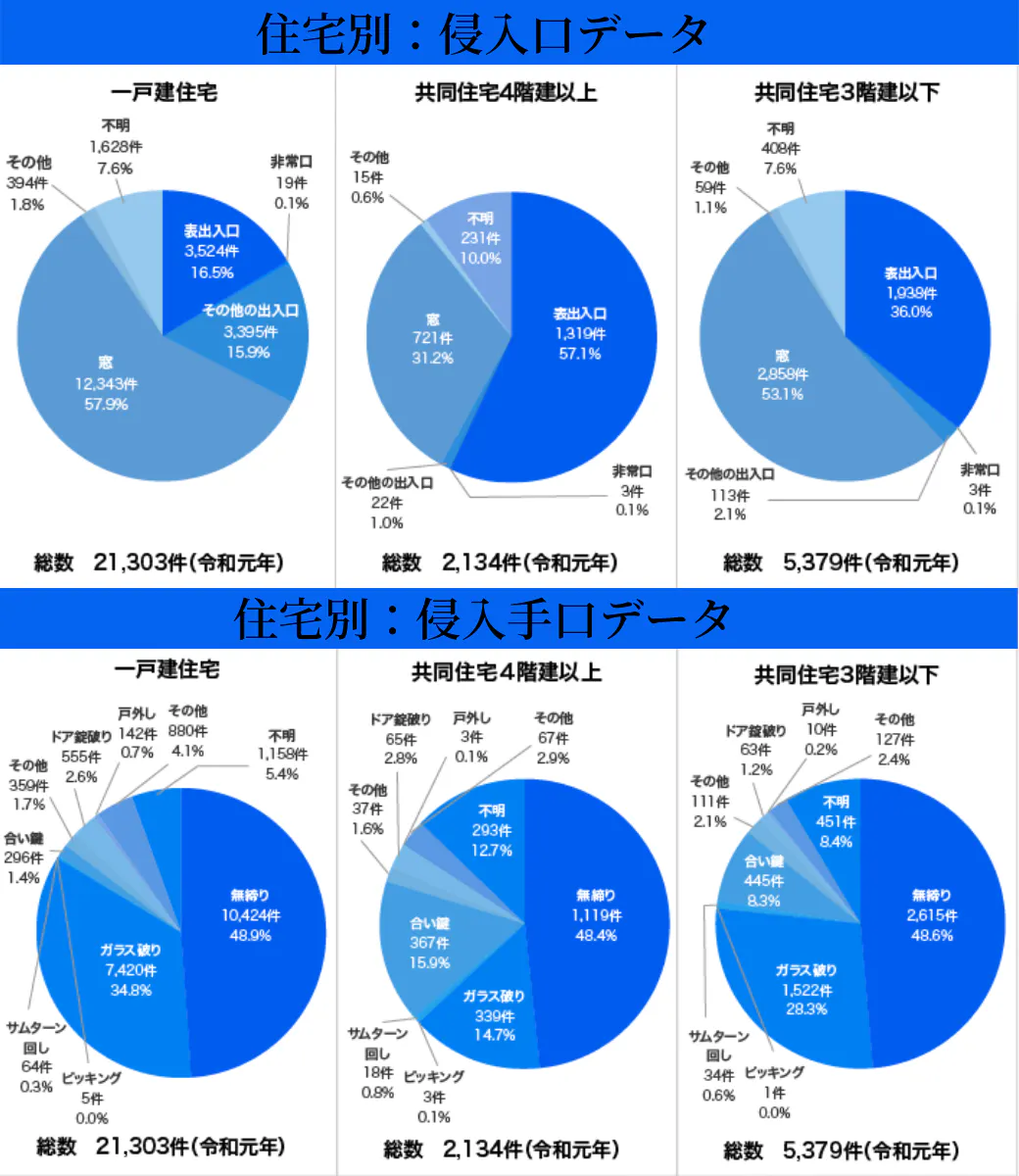 警察庁のデータによると、一戸建てと3階建以下の共同住宅は、窓からの侵入が圧倒的に多く、