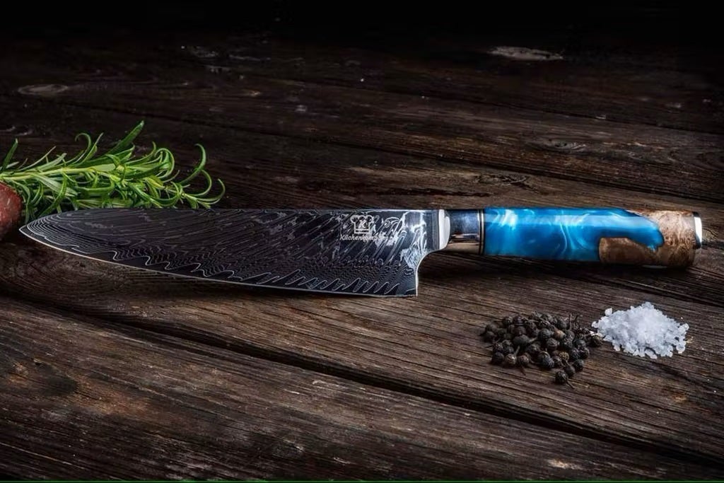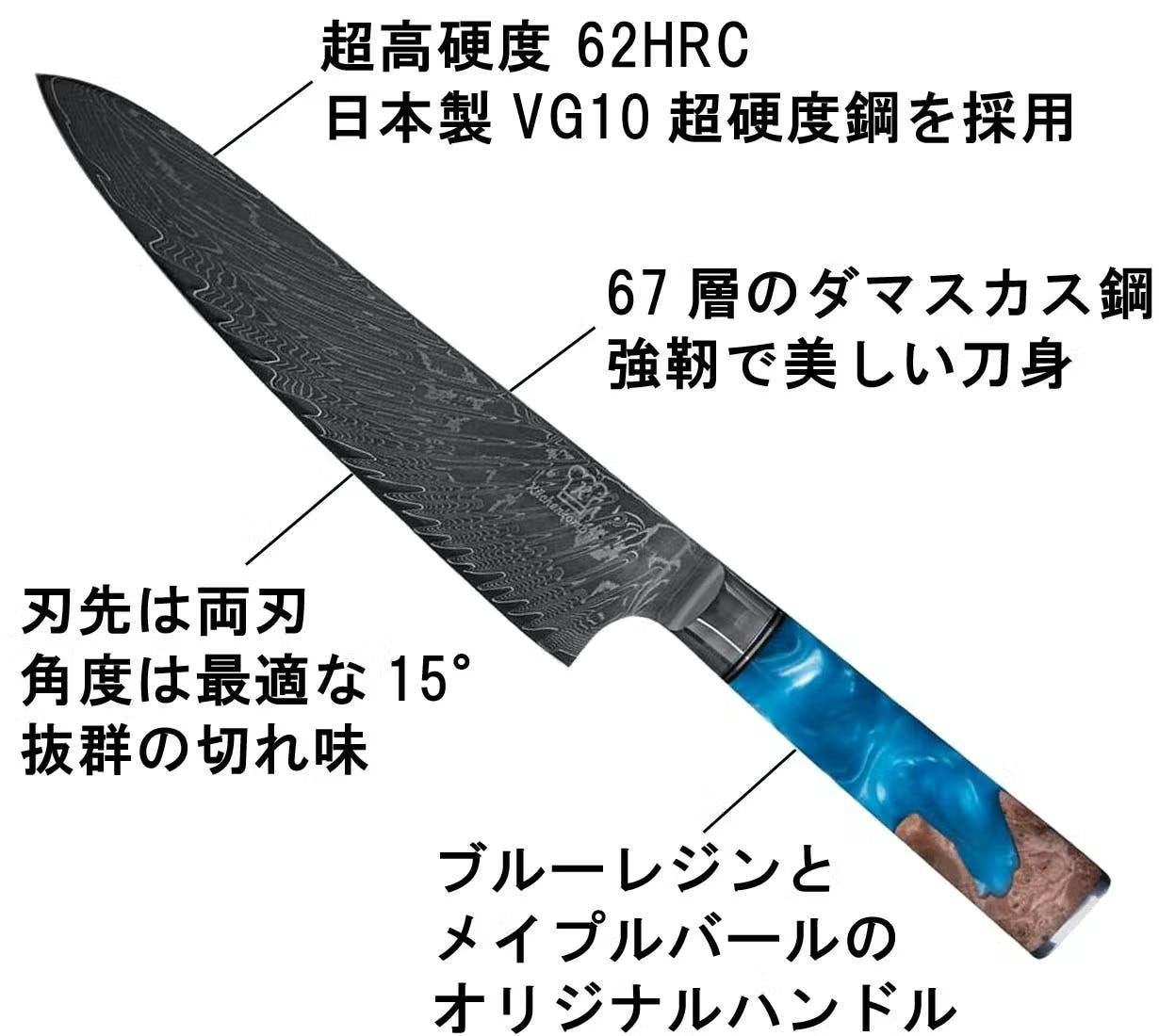 67層のダマスカス鋼の模様もさることながら、ブルーレジンとメイプルバールを融合させたハンドルのデザイン性にも惹かれました。