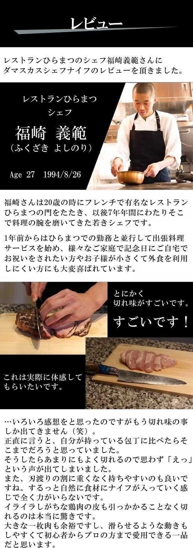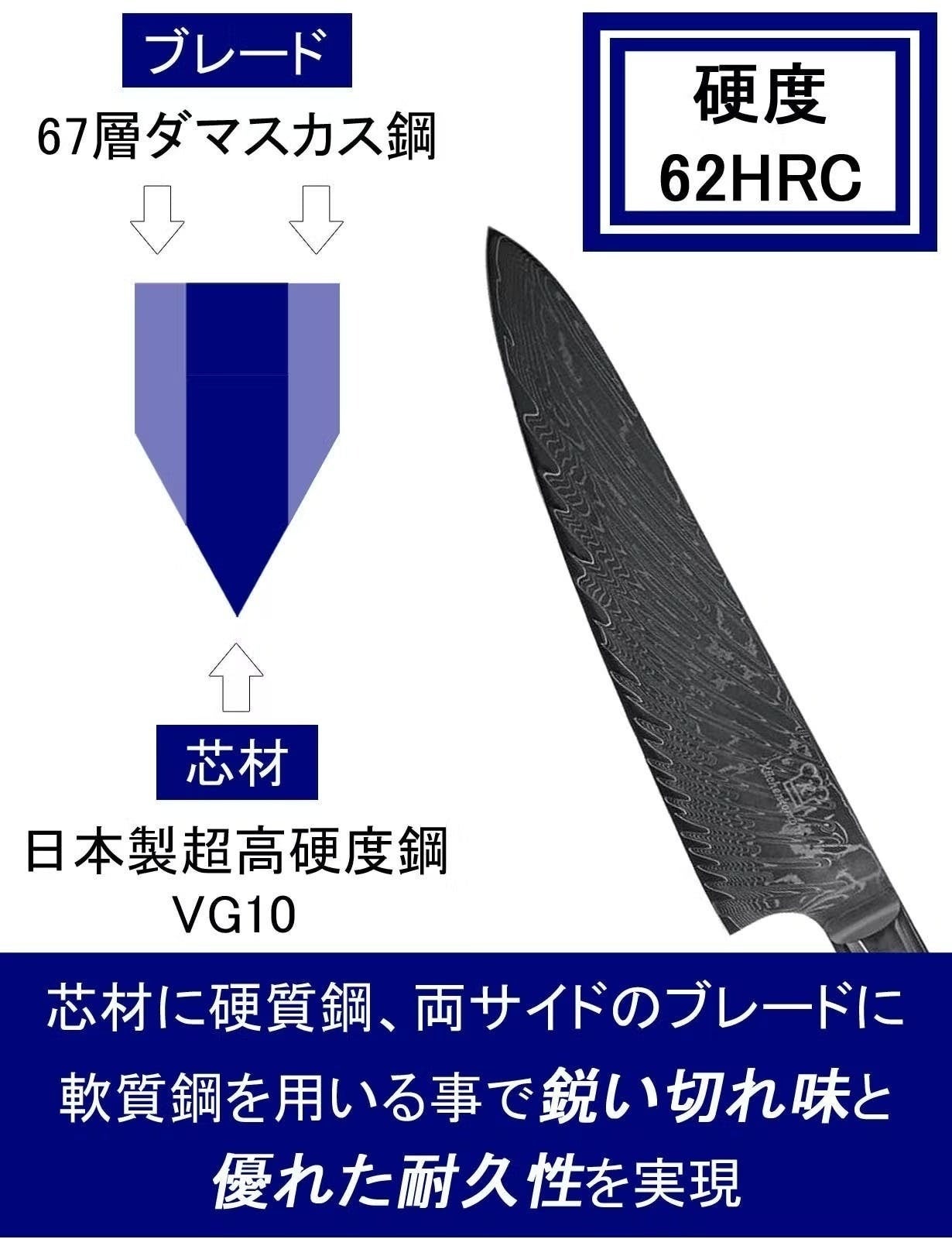 両サイドに粘り強いダマスカス鋼を接合する事で、極上の切れ味と優れた耐久性を兼ね備えたシェフナイフを生み出しました。