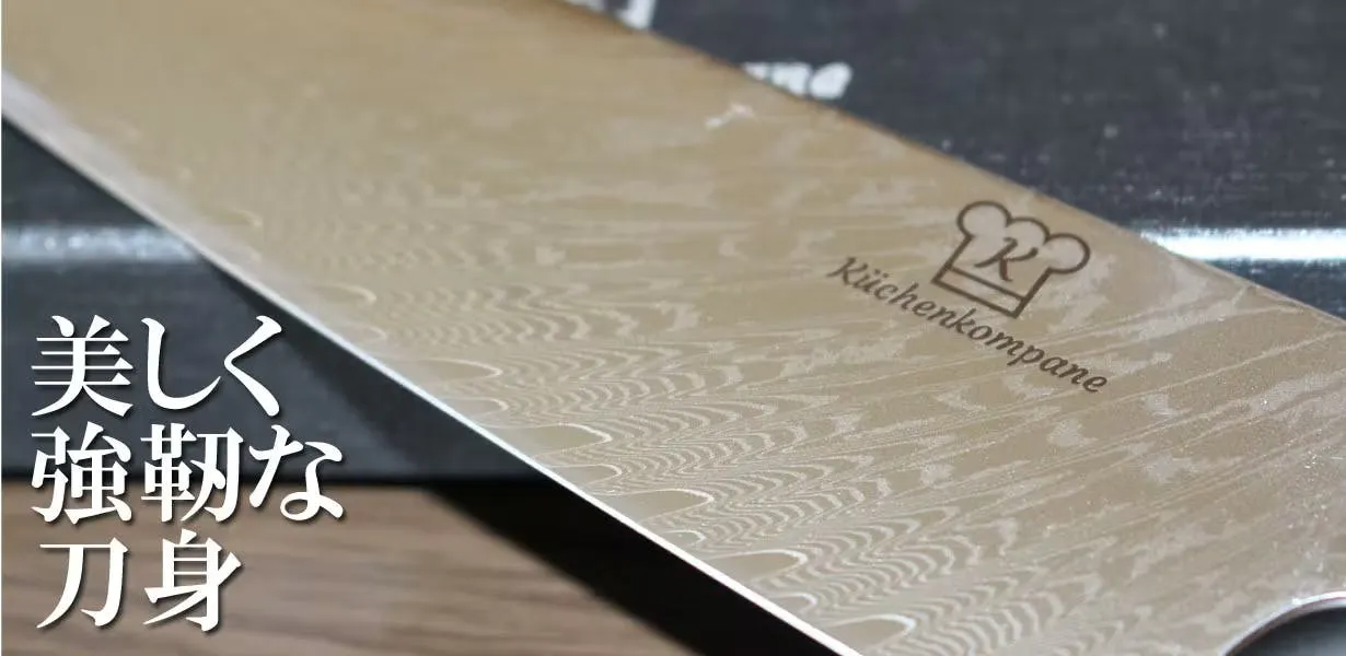 Küchenkompaneのシェフナイフは、芯材のVG10を挟む鋼にステンレスダマスカス鋼を使用し、強靭で美しい刀身を実現しています。
