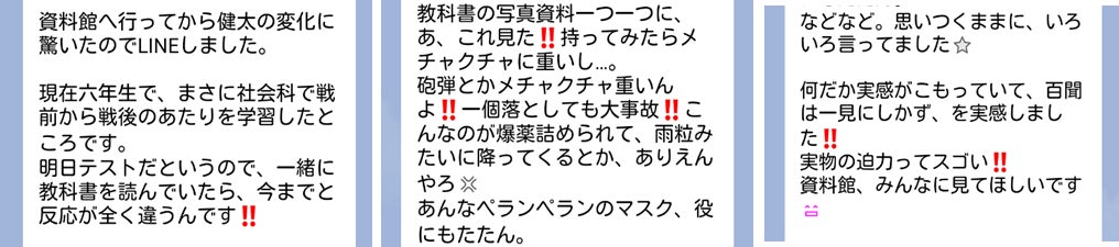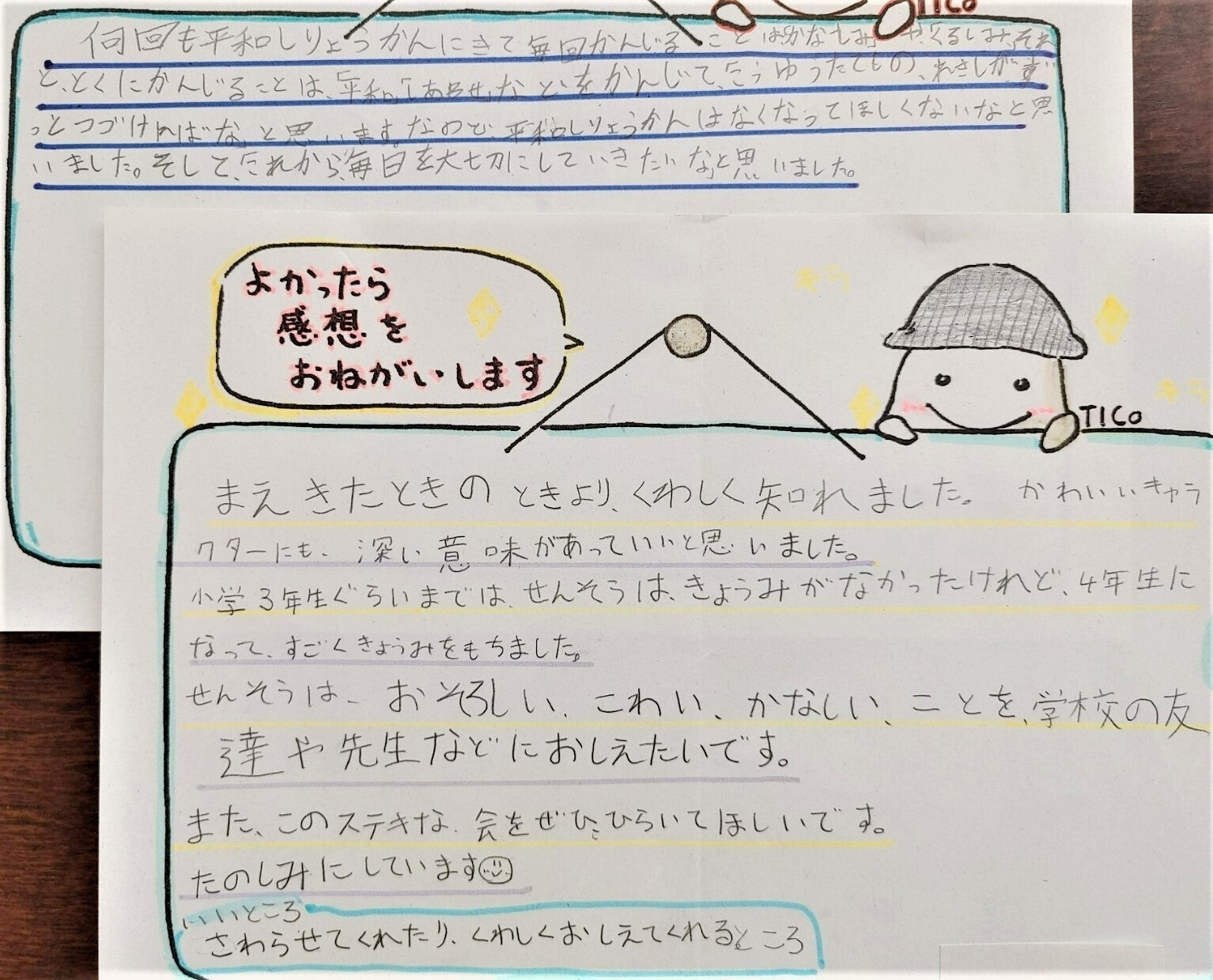 「感想ノート」より 来館者の様子から、「触れる」ことで想像が広がるなど、理解が深まることが分かります。だから、資料の修理、保存方法などを学びながら、引き継ぎたいと思います。