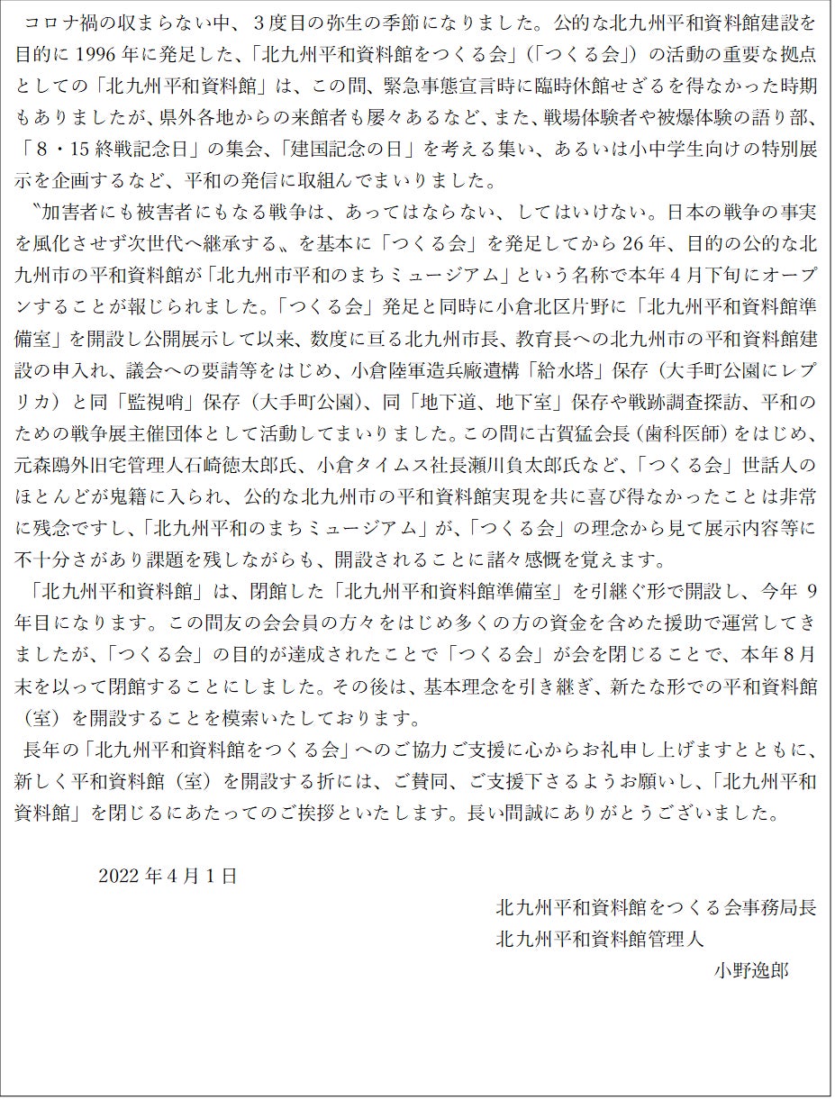 『北九州平和資料館』は、8月に閉館することになっています。(8月25日に閉館しました。)