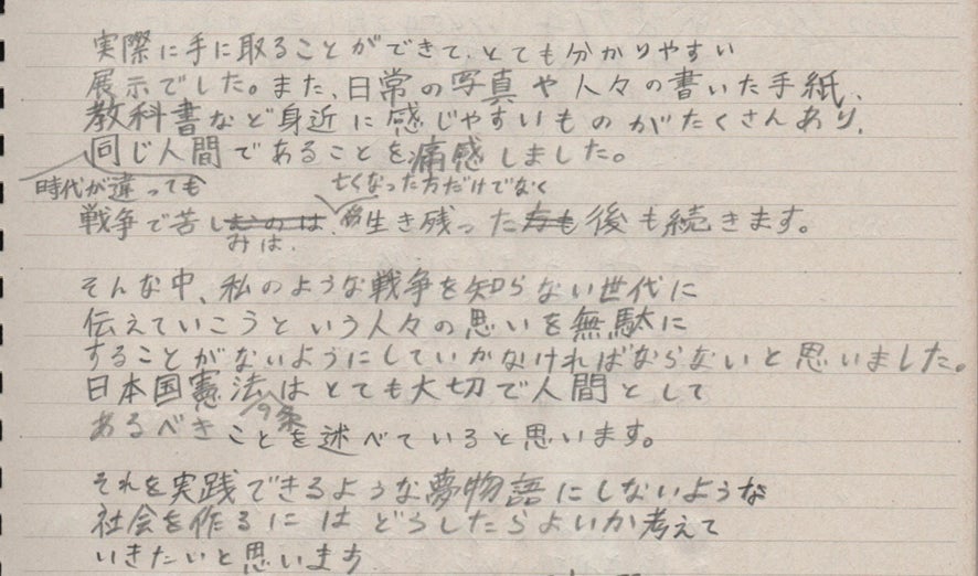 平和を築き、守るためには、戦争で起きた事実(加害・被害を問わず)を知り、そこに生きた(る)人々の立場で想像することが必要だと考えています。