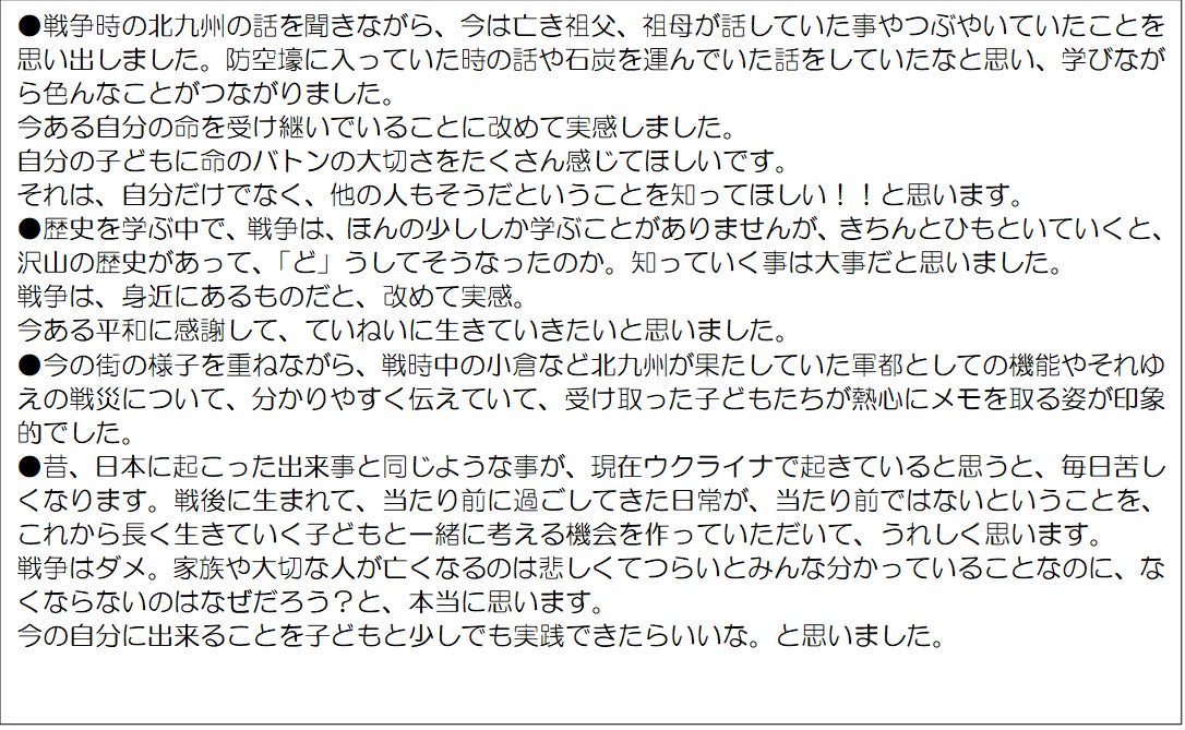 若松の平和資料館に初めて行った時、小四だった息子が実際に使われていた鉄かぶとを被り、リュックを背負わせてもらいました。兵隊さんはこんな重たいものを持って戦っていたのかと肌で感じることができました。それから、息子の中で兵隊さんはどんな気持ちだったのか?どうして戦争は起こったのか?どのように暮らしていたのか?たくさんの「ど」が溢れ、疑問や興味が出てきました。反対に「お母さん、なんで?」の質問に上手く答えられない自分もいました。こまさんから、学習会開催のお誘いをうけた時には、ぜひっ、参加したい!と思いました。学習会をしたあと、平和ってこんなことかな?と親子でよく会話をするようになりました。学校で友だちと会って遊ぶこと、家族で美味しいご飯を食べていること、などなど。当たり前のことを平和だと感じられようになったのは、平和資料館で学んだからだと思います。学習会で「未来ある今の子ども達が銃をもつことのないように。。」のこまさんの言葉が頭から離れません。触って、感じ、学ぼうとする力が溢れてきた資料館がなくなるのは、ほんとにもったいない!!たくさんの人にそれを感じて欲しいです。まだまだ、私達は学ぶことがたくさんあると思います。忘れないように学び続けることが大切だと思うのです。それは、子どもだけでなく、大人も同じです。その場所を引き継ごうとしているこまさんを全力で応援したいです。どうか、皆さんも力を貸してください!