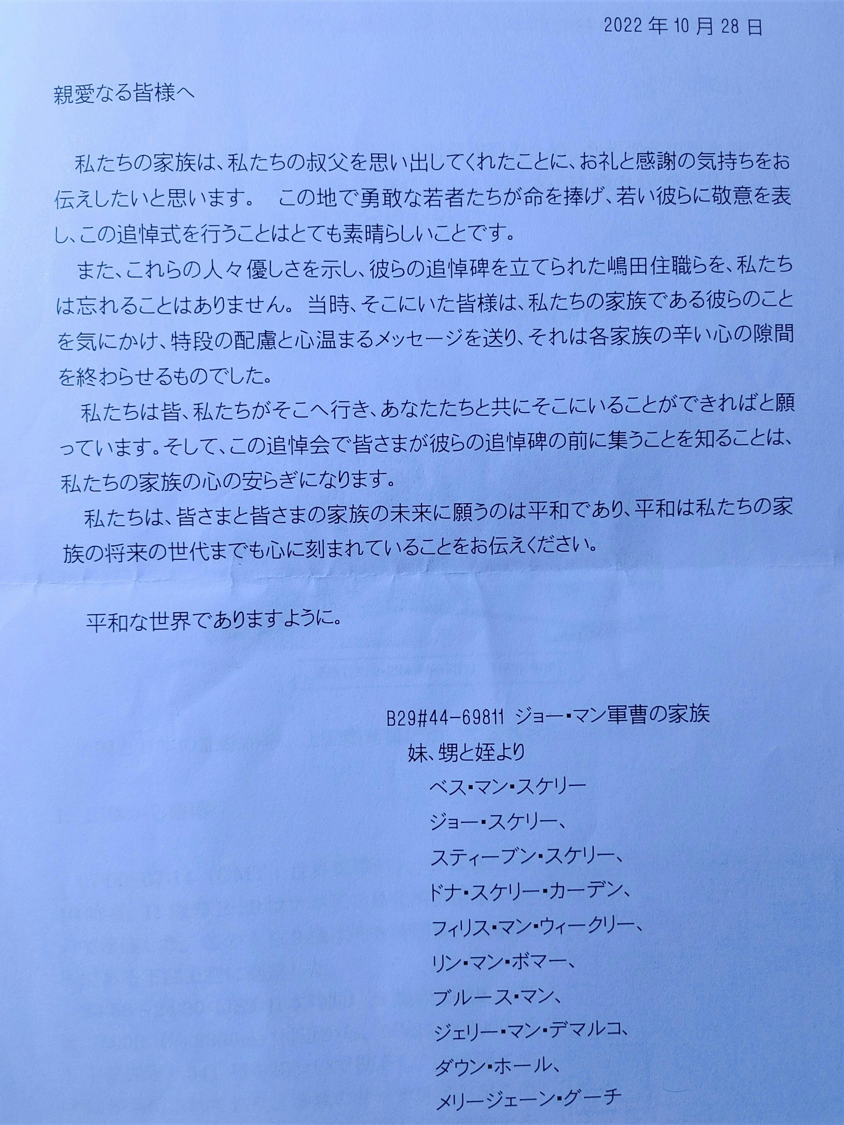 この手紙は、B29搭乗員ジョー・マン軍曹のご家族から私たちにあてた手紙です。