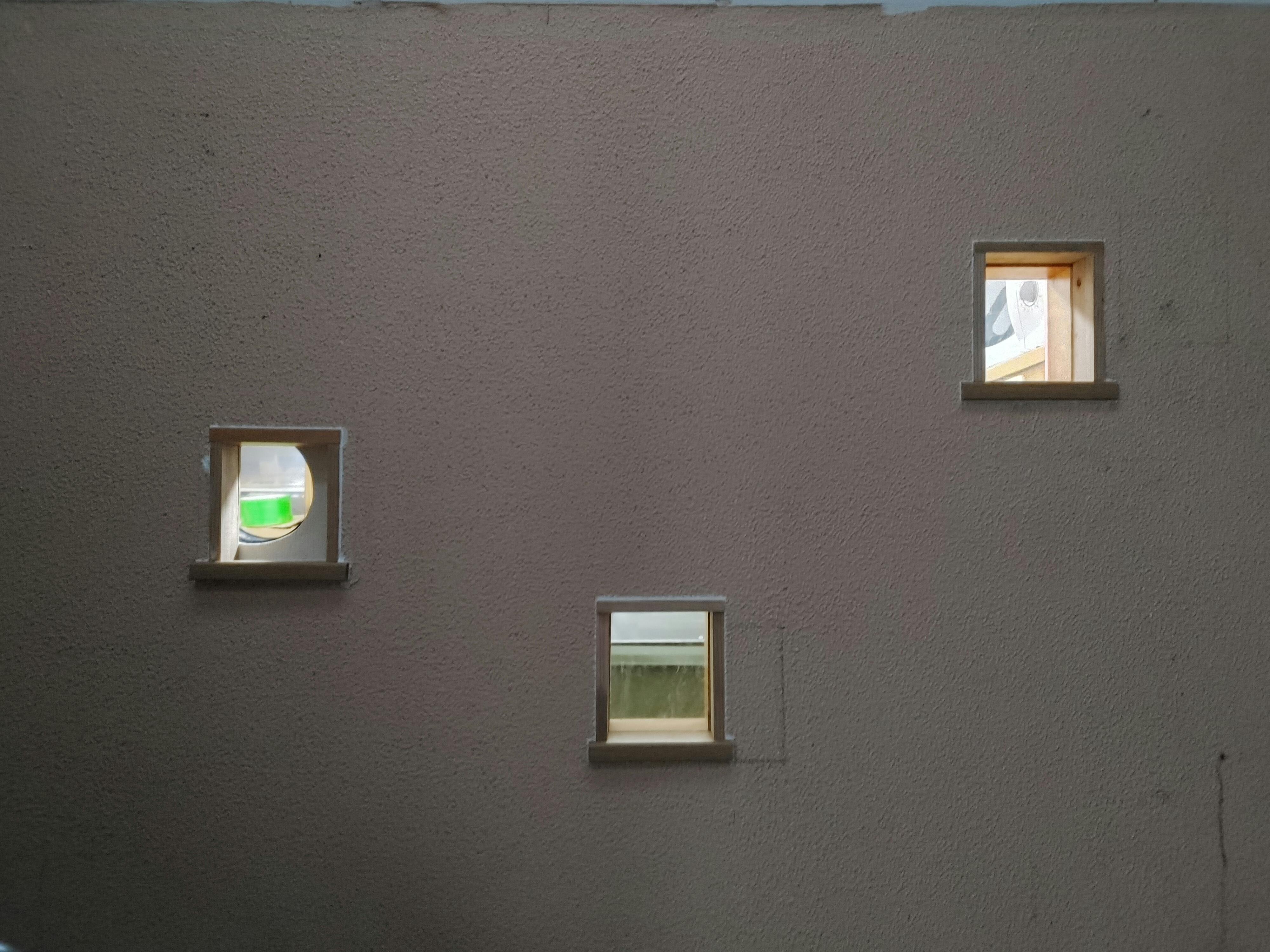 中の小窓は最後に開けたのですが、開けてみると、建物の強度を保つ「すじかい」にぶつかってしまいました。