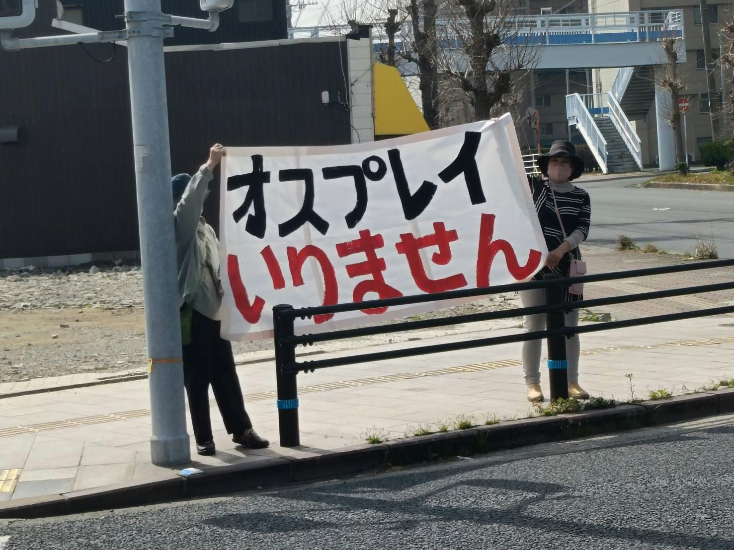 昨年、宮古島と石垣島の視察に一緒に行った方と、「とりあえず横断幕を持って立とう!」と決めたのですが、毎月2日に、築城基地でスタンディングをしている方が数名、集まっていました。