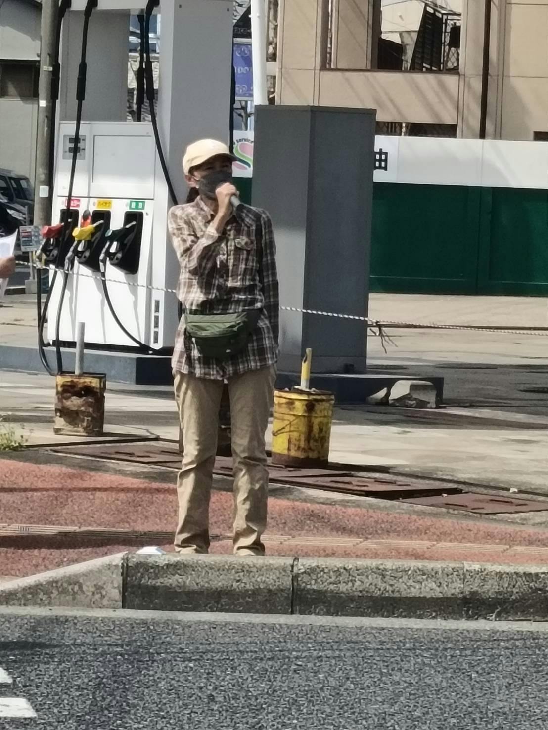 マイクの準備もしていて、買い物に来ている人や芦屋基地の近所の人に「オスプレイ」のことや「近年の日本の軍事化」のことを話していました。
