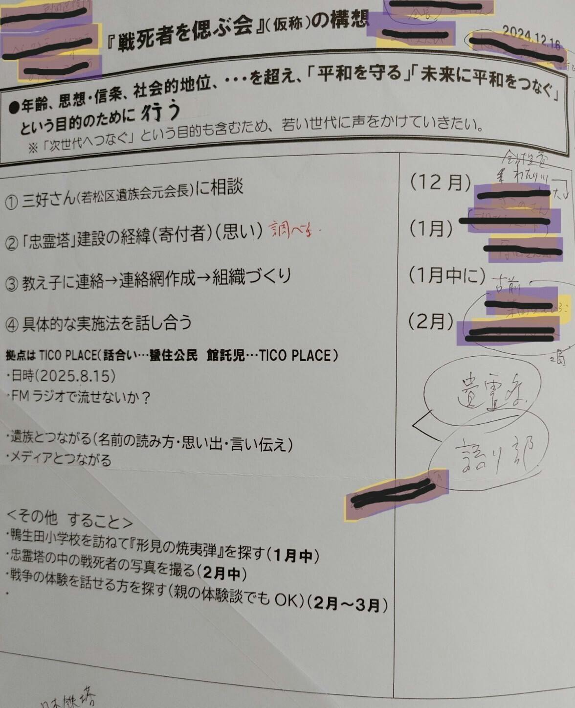 若松遺族会の会長さんに相談に行った時に、作った計画表。