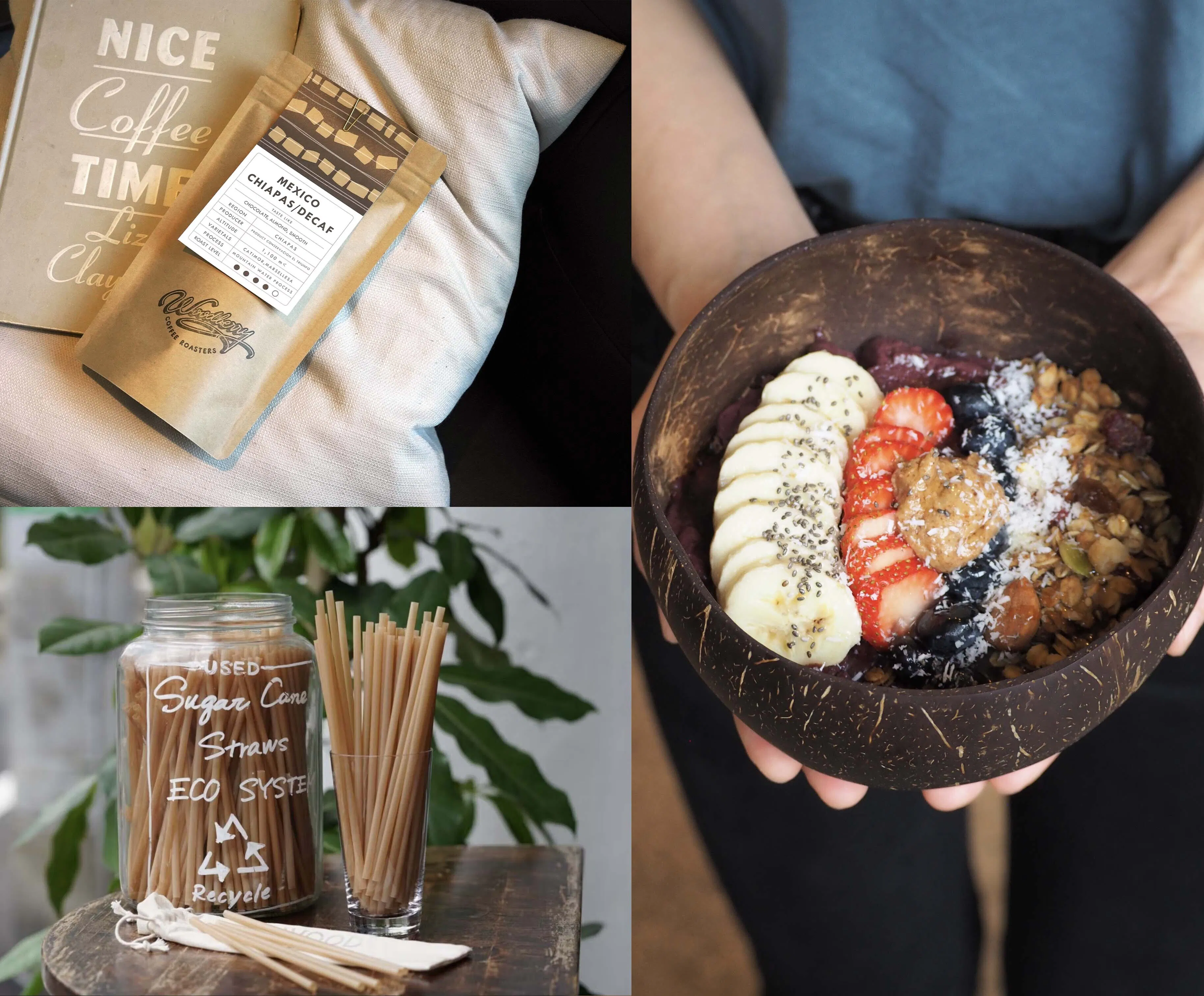 カフェではヴィーガンのメニューを数多く取り揃え、可能な限り食材はオーガニックのものを使用しています。また、さとうきびの搾カスから作られたエコストローや紙カップを使用し、脱プラスチック及び排出されるゴミの量を削減をし、将来的にはゼロウェイストを目指しています。