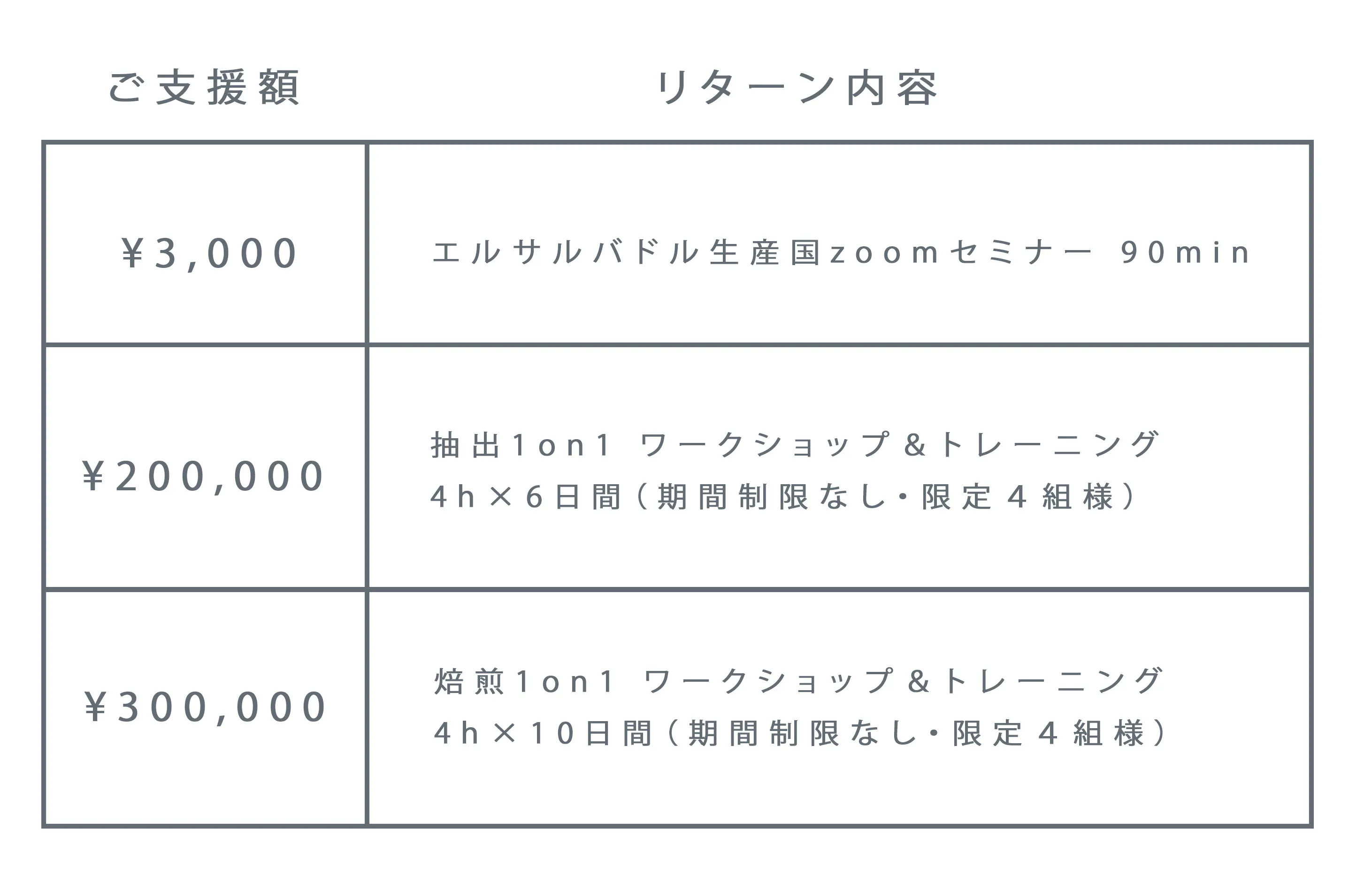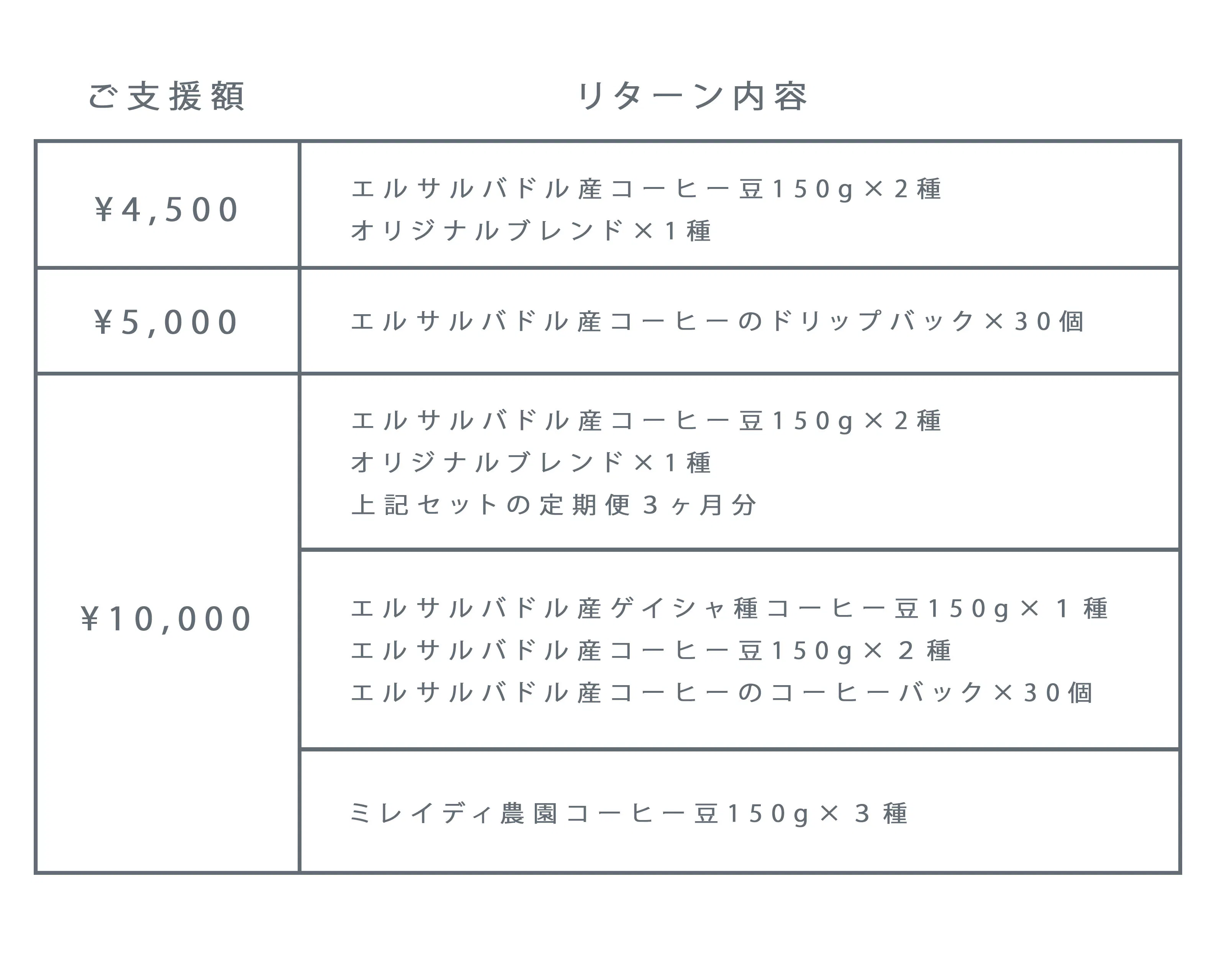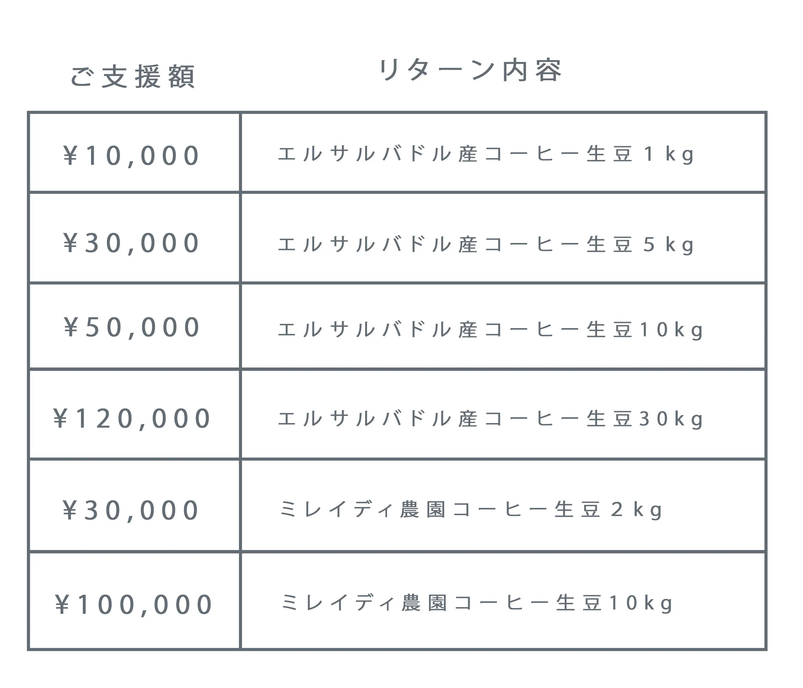 今回のクラウドファンディングでは全国のご家庭でコーヒーを楽しんでいただいている方にはエルサルバドル産のコーヒー豆のセット(粉にもできます!)やドリップバックなどを。いつもウッドベリーコーヒーをご利用していただいているお客様にはお得なプリペイドカードやドリンクフリーチケットをリターン品としてご用意させていただきました。また、自家焙煎やカフェなどの店舗を運営されている方にもご利用いただけるセミナーや生豆のリターンもご用意させていただきました。輸入のコンテナは6月~7月にエルサルバドルを出港予定ですので、リターンの発送は秋頃を予定しています。