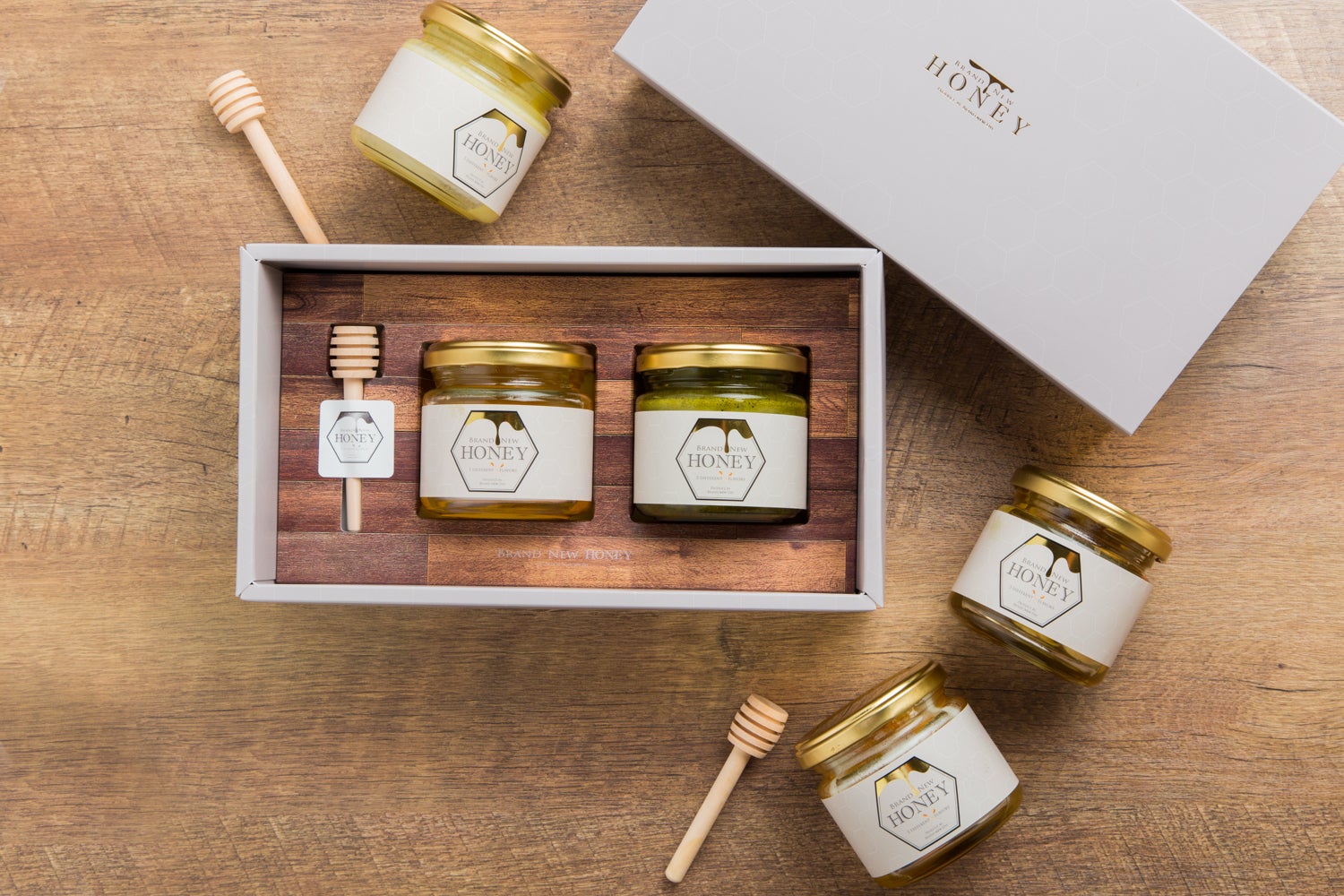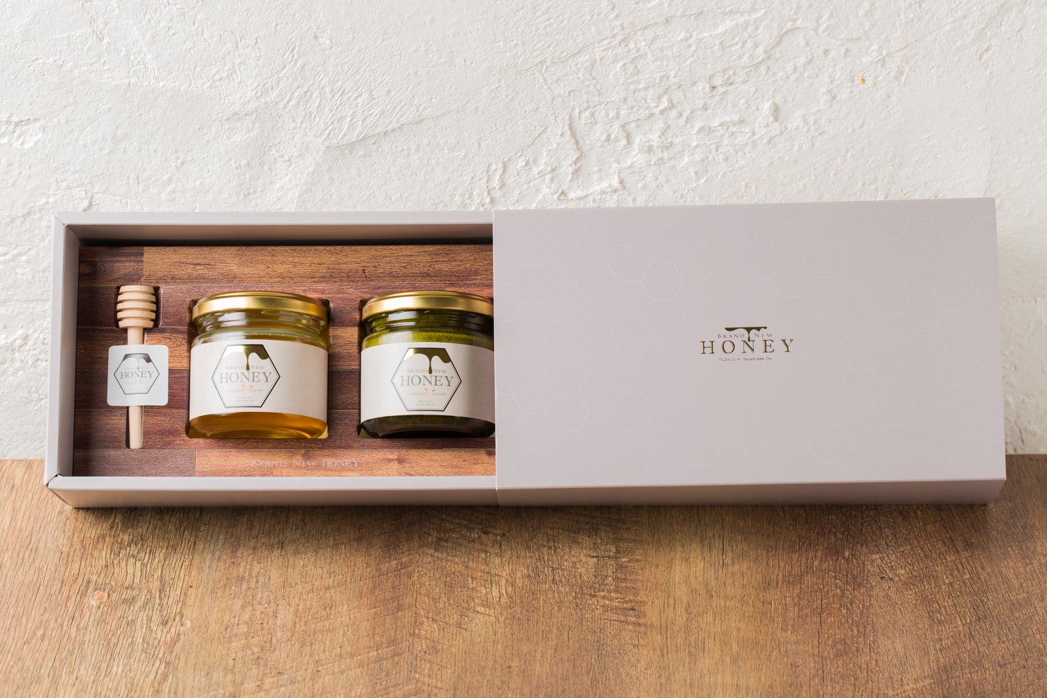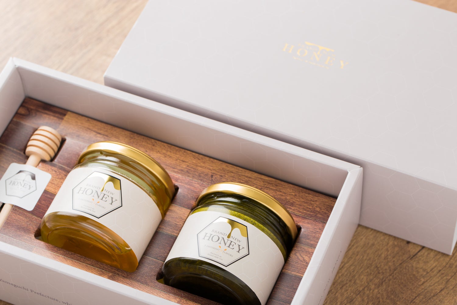 BRAND NEW HONEYの5種のはちみつから2種好きなものをチョイスしてギフトボックスに。はちみつは贈る相手の健康を気遣う贈り物です。大切な方へのプレゼントにどうぞ。また、はちみつは英語にするとハニー、最愛の人の意味でも用いられます。ボックスの中で番い(つがい)になっている事から結婚式での引出物にも人気です。ハニースパイラルという専用マドラーも可愛く人気です。