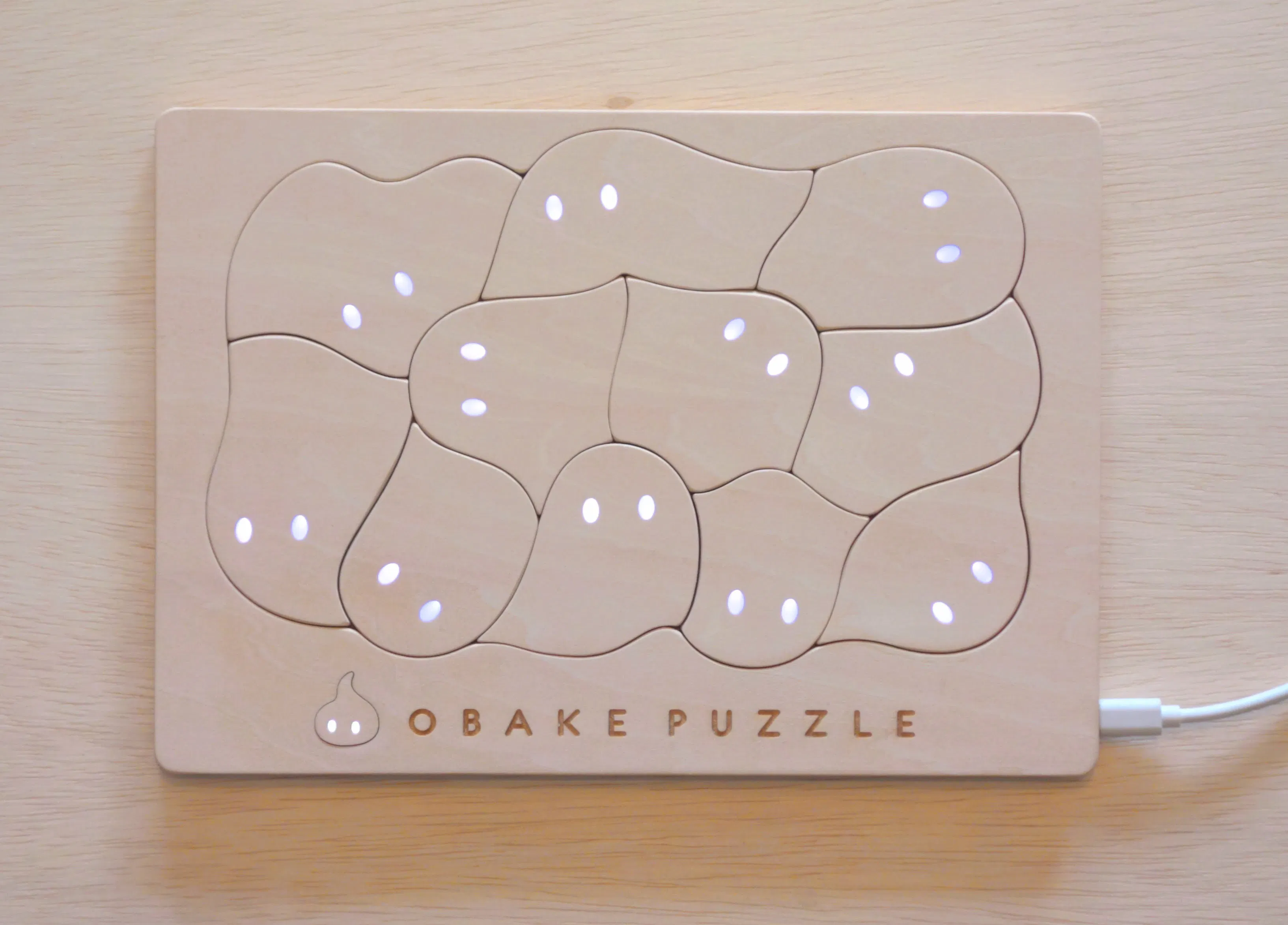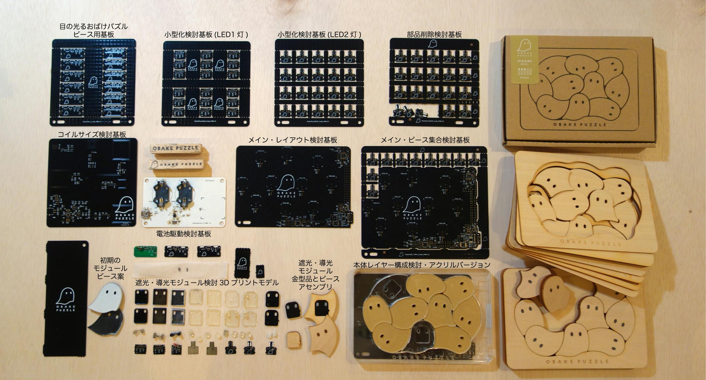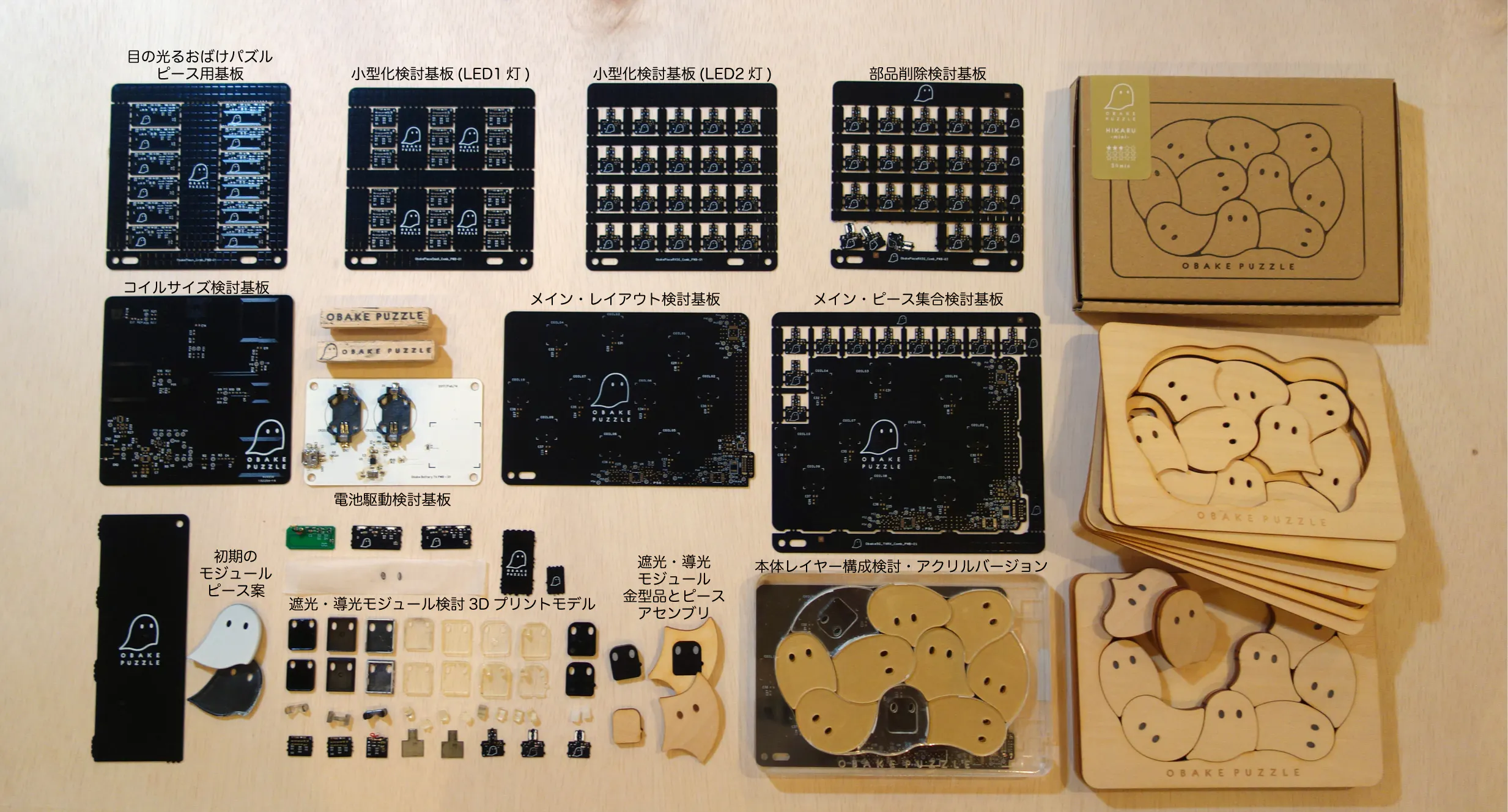 なんとか手に届く価格で目の光るおばけパズルを提供するには 木の加工時間、基板のサイズなど、小型化が必須だったんだ。 最初はでもなかなか小型化しきれなくて、5ピースで作ることを考えていたんだ