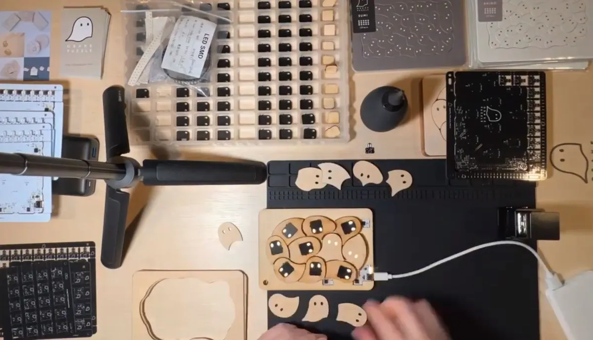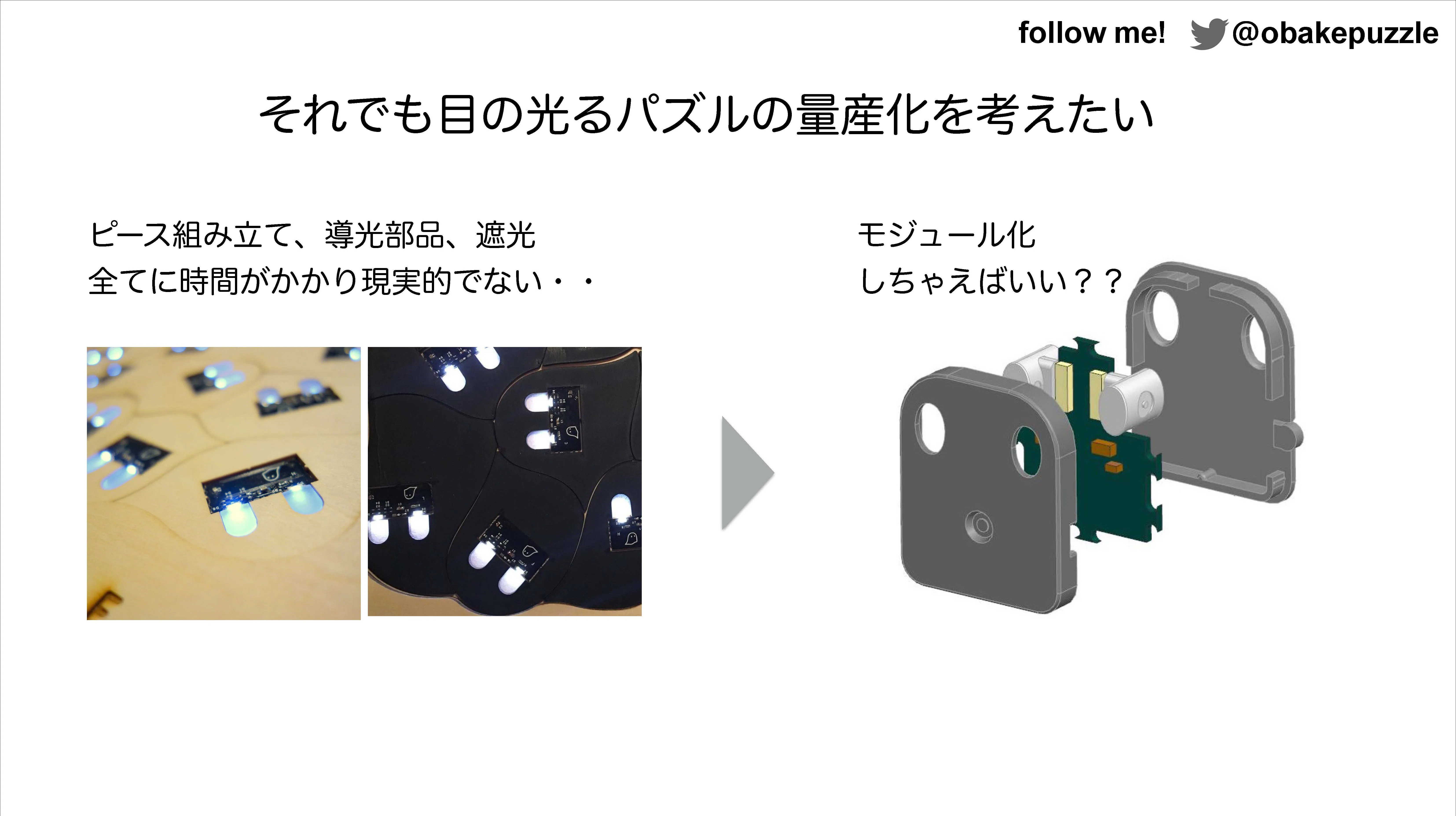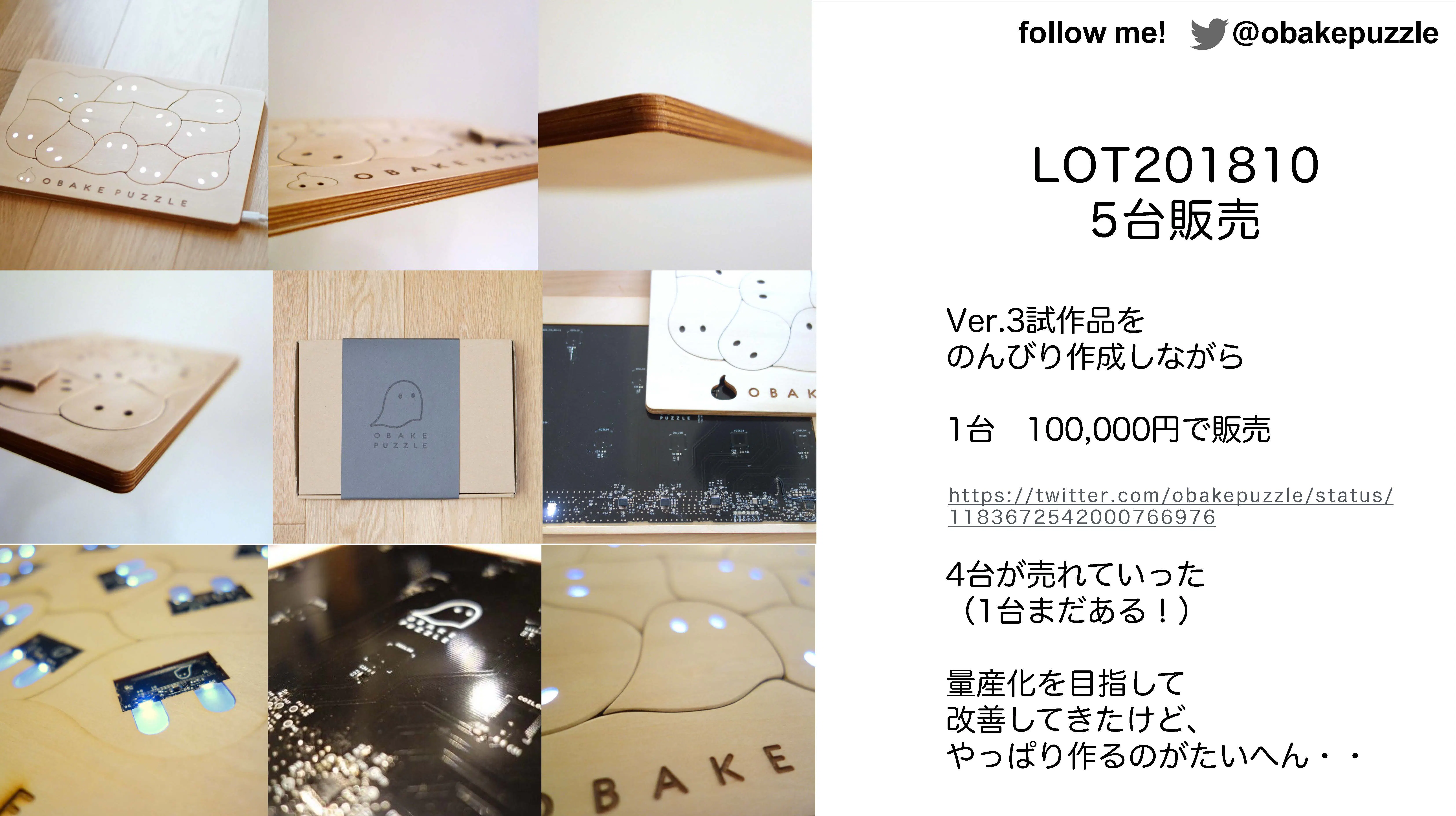 なんとか手に届く価格で目の光るおばけパズルを提供するには 木の加工時間、基板のサイズなど、小型化が必須だったんだ。 最初はでもなかなか小型化しきれなくて、5ピースで作ることを考えていたんだ