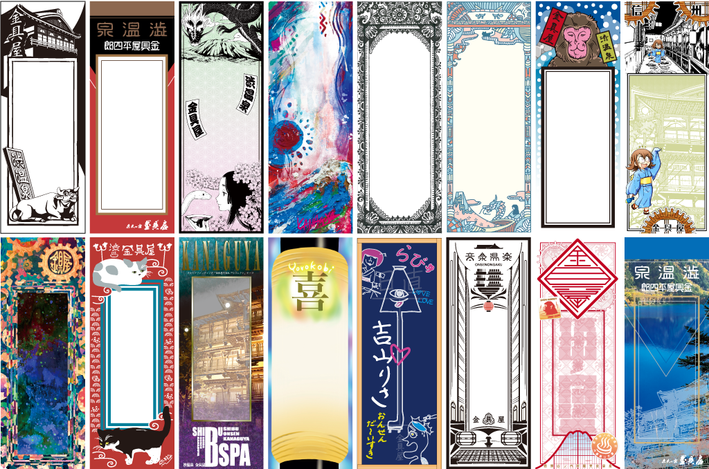 これまで金具屋、渋温泉では、さまざまな方に温泉地の魅力を知ってももらうべく、音楽イベントやアートイベント、ゲームや漫画・アニメとのコラボなどを行ってきました。その中でたくさんのアーティスト、作家、デザイナーなどタレントのある方々と知り合い、親しくさせていただいております。その方々とイベントの時だけでなく、なにか一緒にできることはないかと思っていました。今回のリターンでは、そういった金具屋とゆかりのある方々にご協力いただき、千社札のデザインをしていただいております。