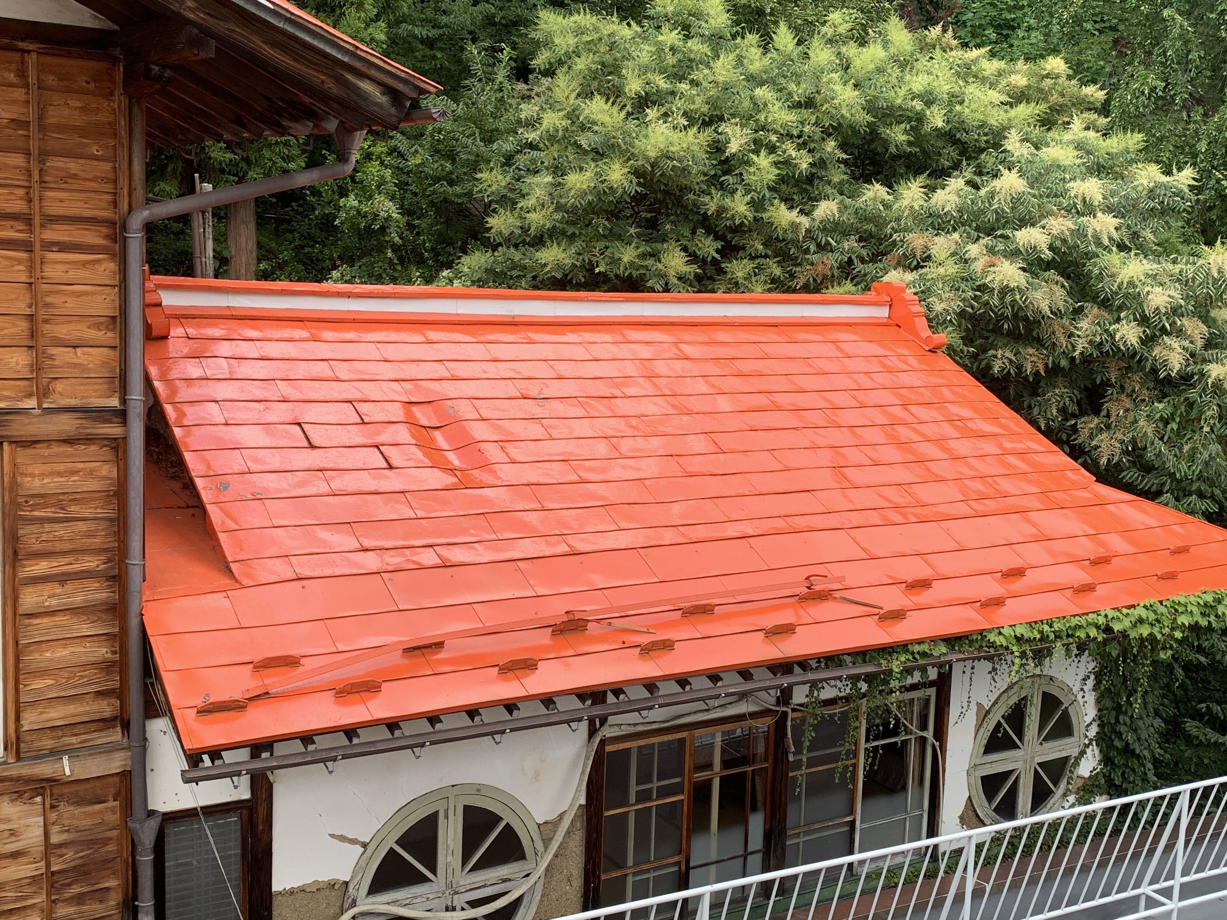 今年の冬は5,6年ぶりに雪が多く、積雪による被害が多数発生しましたが、この雲井の間の屋根も雪により大きく傷んでいたようです。春~夏にかけて雨が浸透し内部も傷んでしまいこのように大きなへこみができるまでになってしまいました。