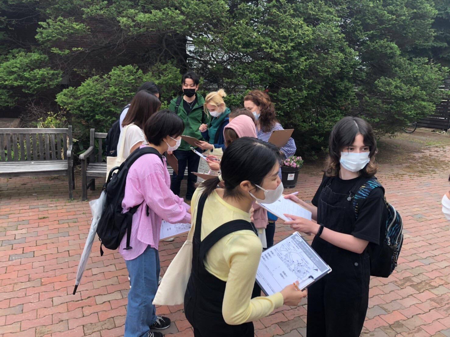 2022/07/17 12:25今回は4名の大学生に協力してもらい、お花がたくさん咲いている公園で屋外授業をしました。名前や趣味などを質問して、交流をしながら日本語会話をたくさん練習しました。公園内では、散歩をしながらクイズが書かれた看板を回り、用紙の回答欄を埋めていくオリエンテーリングが開催されています。お花に関する問題は、少し難しいものも多かったです。参加してくれた大学生の皆さんのお手伝いもあり、みなさん回答できました。日本語ではまだコミュニケーションが難しい部分は、英語で補ってとても良い交流が出来ました。ひまわりやユリなどもちょうど見ごろで、写真を撮りながら体験型の屋外授業ができました。ご協力いただいたみなさん、有難う御座いました! もっと見る
