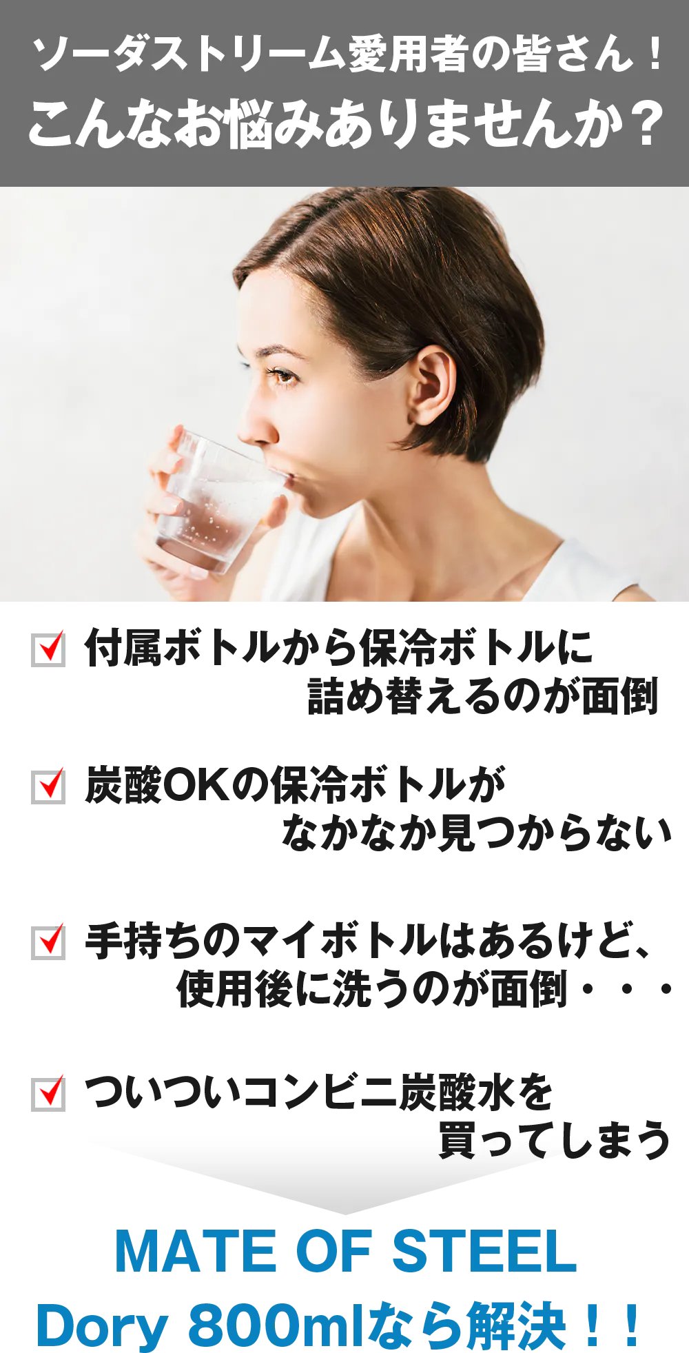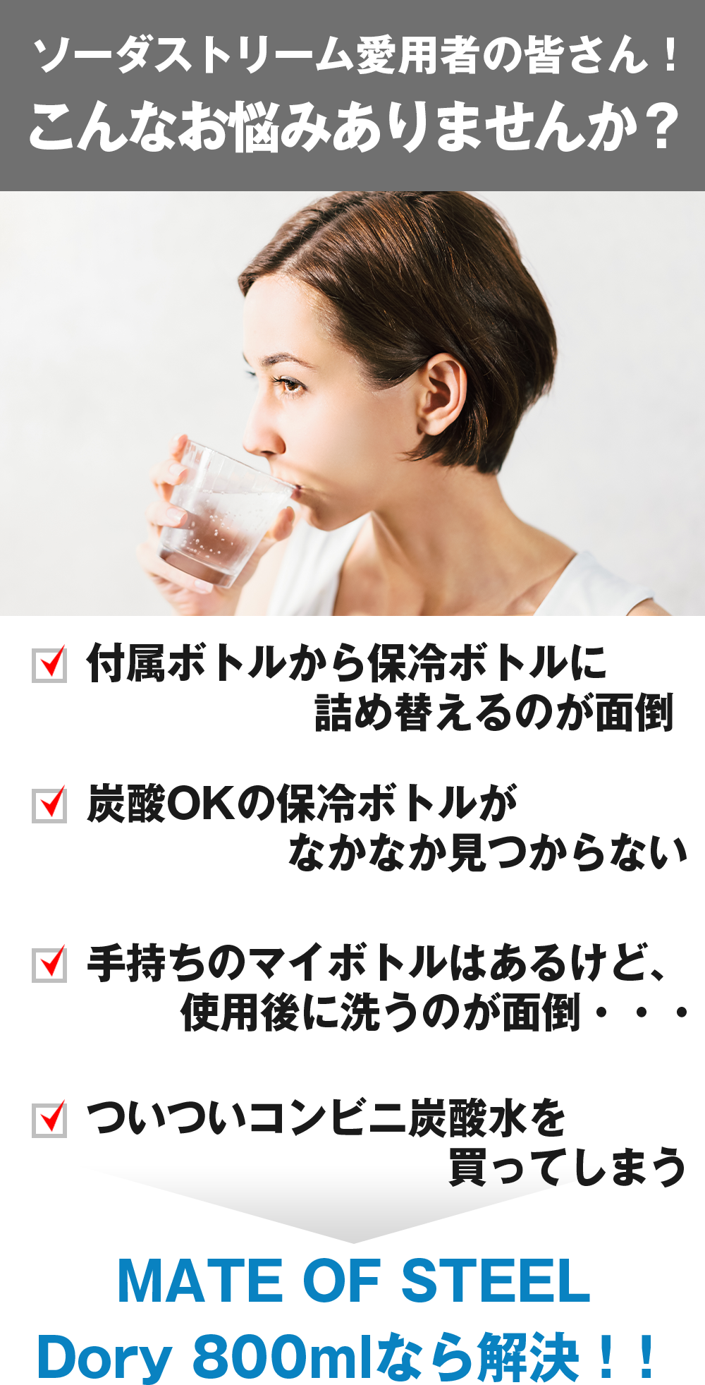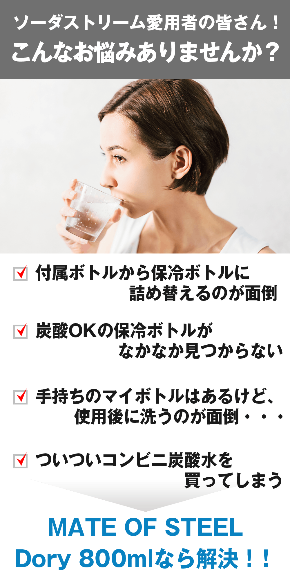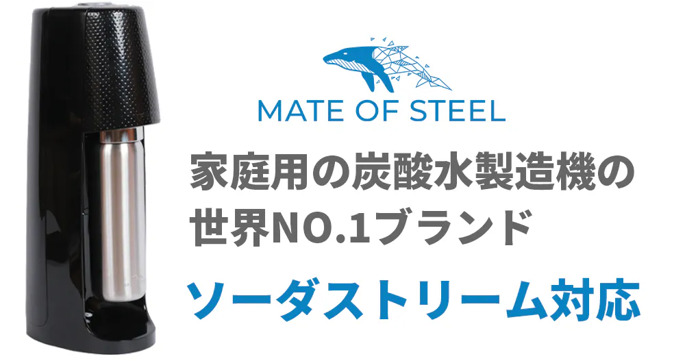 *免責事項: MATE OF STEELは、様々なSodaStream機器に適した高品質のステンレスボトルを製造する独立したブランドです。MATE OF STEELや(株)GEEK TRADEはSodaStream International Ltd.やその商標である "SodaStream "とは提携していません。