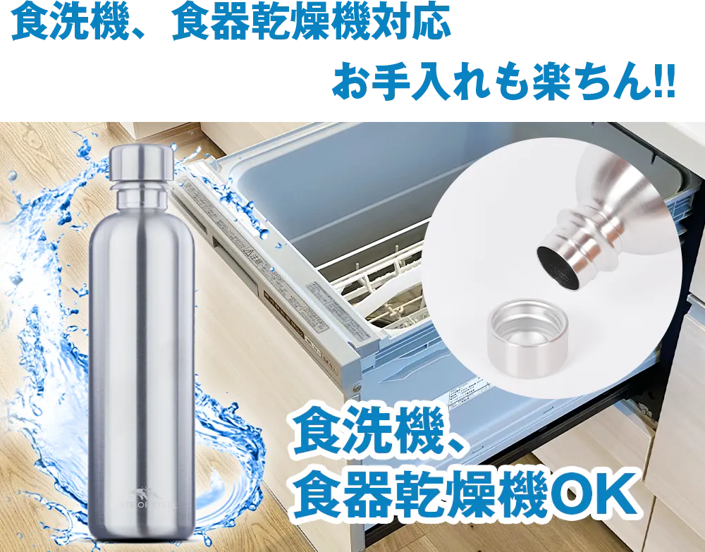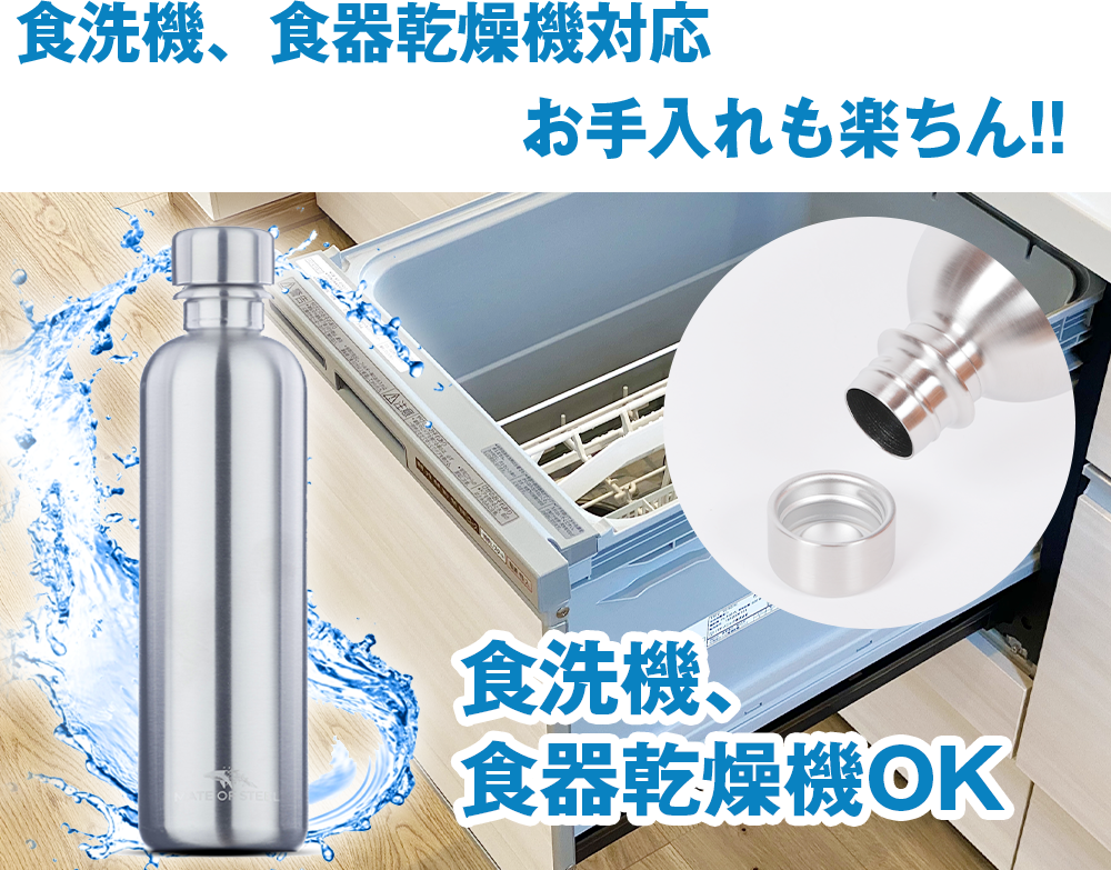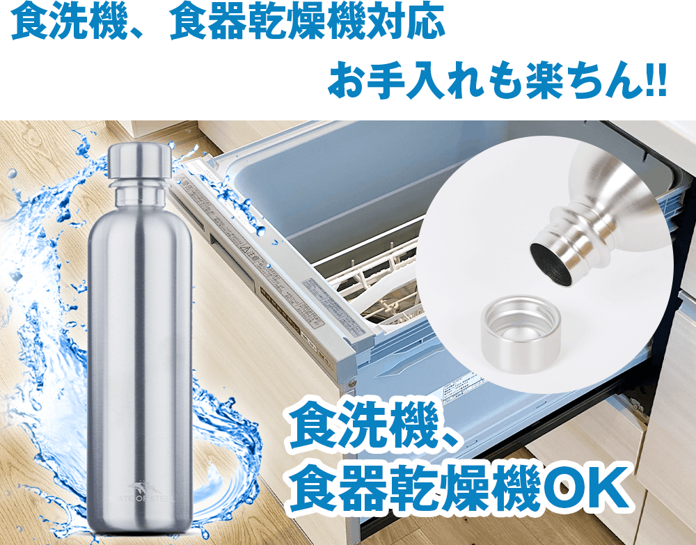 このボトルは18-8ステンレス製で、錆びにくく、汚れがつきにくいという特徴があります。そのため、使用後は水や中性洗剤で洗うことができます。また、パッキン含め、食洗機にも対応しています。
